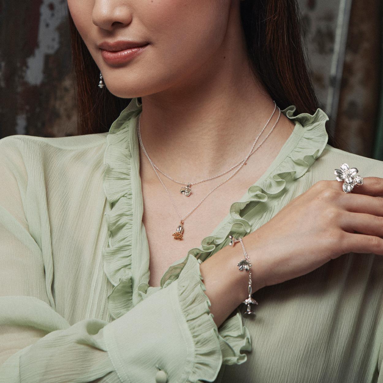 A sure sign that spring has arrived, the Cuckoo Flower blooms in Britain from April. Its delicate flowers have been captured here as a necklace and adorned with a white freshwater pearl, but you will find the real thing in meadows and riverbanks.