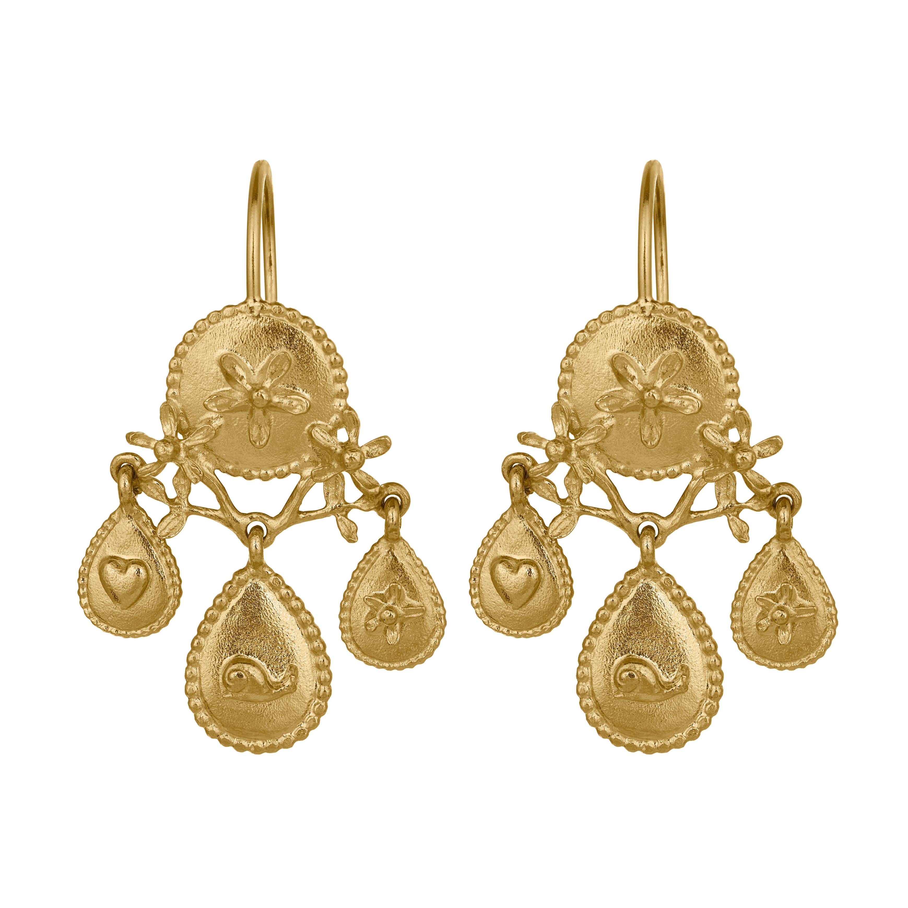 Delicate Ex-voto tokens make up these perfectly balanced Girandole chandelier earrings as an expression of gratitude to nature. Express your gratitude to nature with a whimsical mix of delicate Ex-voto inspired tokens perfectly balanced to form 17th century inspired Girandole chandelier earrings - named after a type of candelabra popular at the time.
