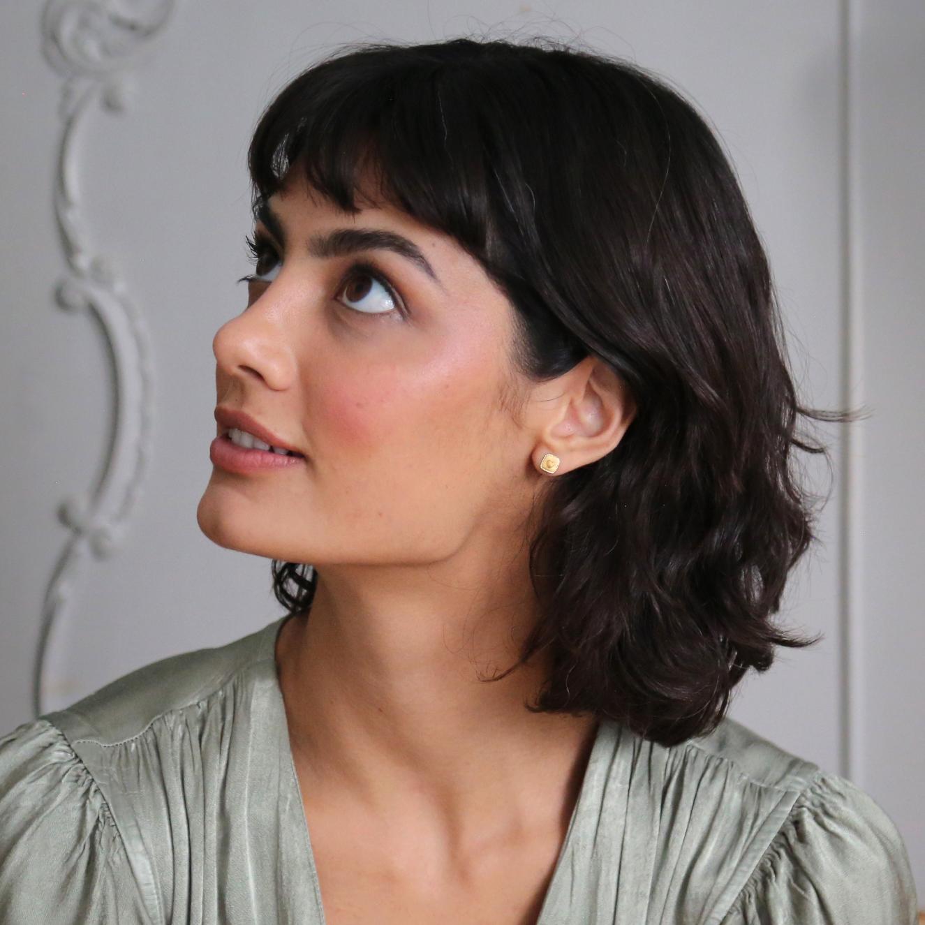 This sweet square shaped single stud earring features a teeny heart, celebrating a love of nature. A tiny square featuring a teeny heart forms a single stud earring, complemented by milgrain border. Inspired by Milagros or Ex-Voto tokens, mix and match these single studs to celebrate a love of nature.