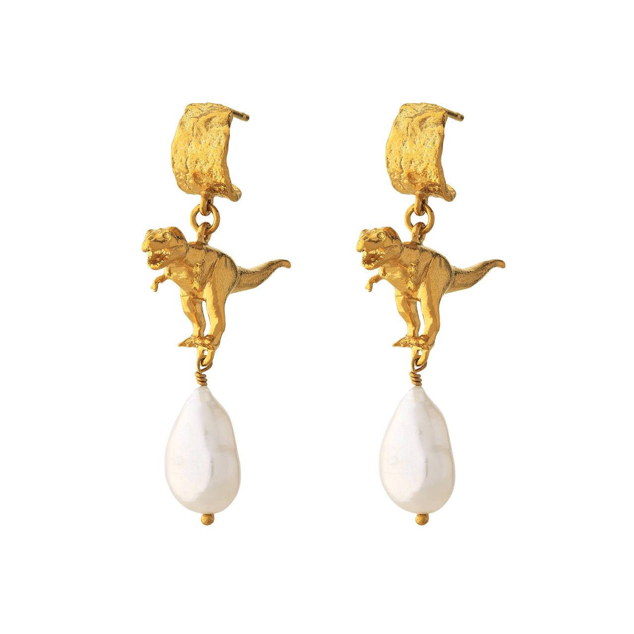 A.M. Bark Huggie Earrings with Tyrannosaurus Rex & Baroque Pearl Drops Gold