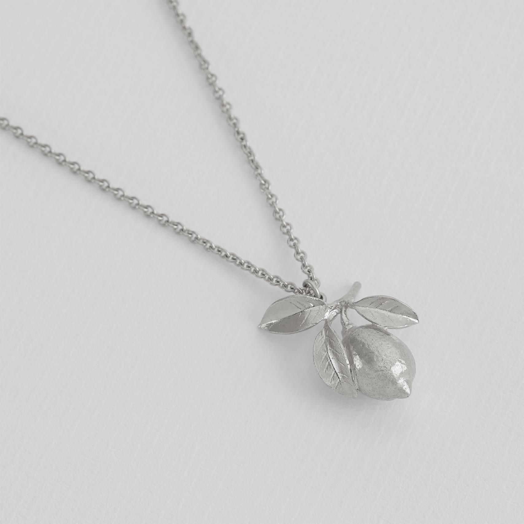 A carefully textured lemon hangs below sculptural leaves, creating a signature pendant necklace - looking perfectly ripe and zesty.