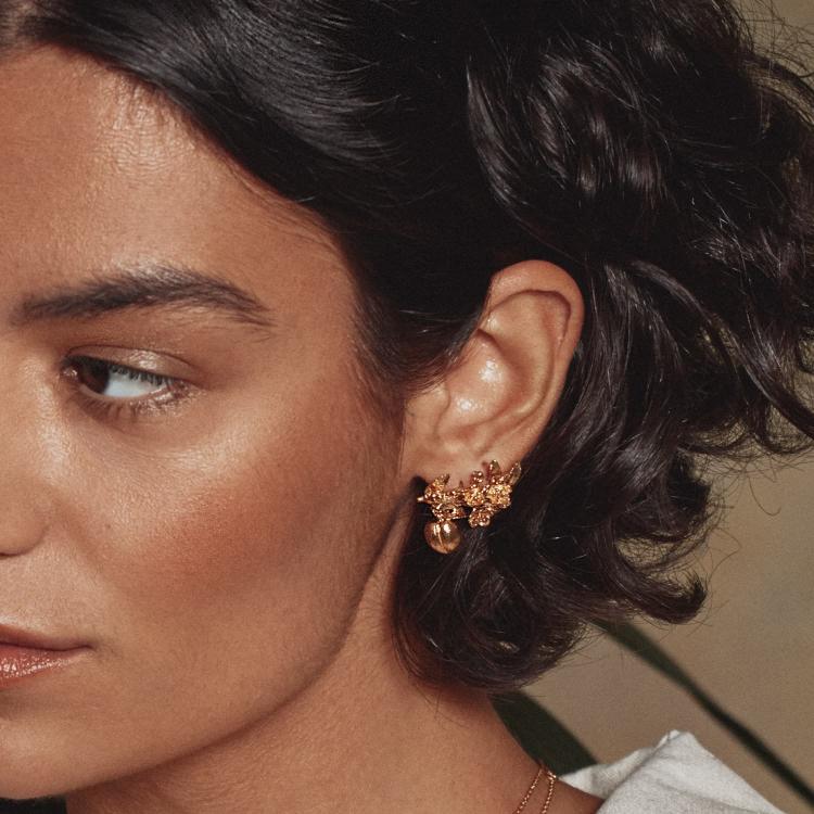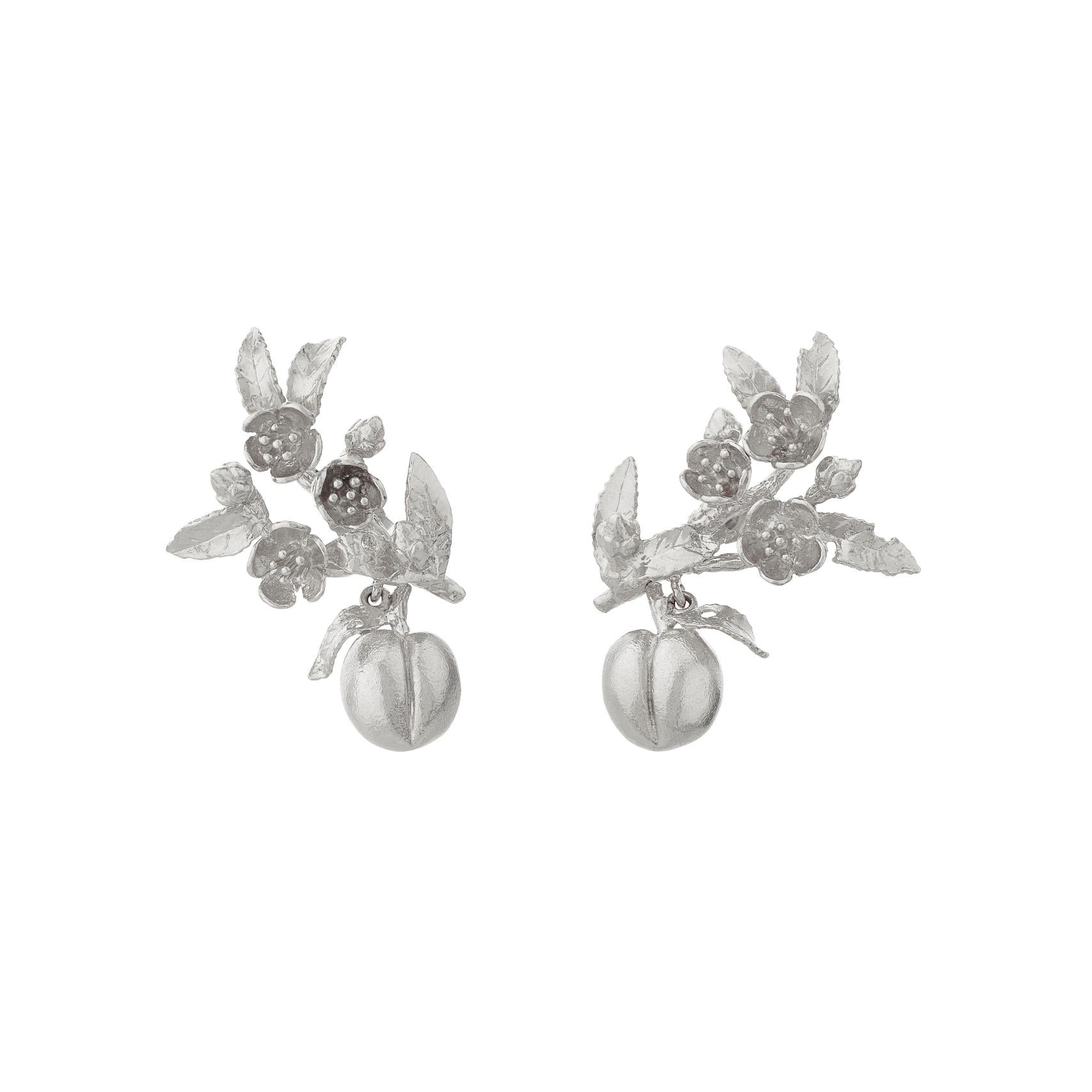 Plump peaches jangle playfully from a textured branch abundant with blossom, to form glamorous, stud earrings which gently climb the ear.