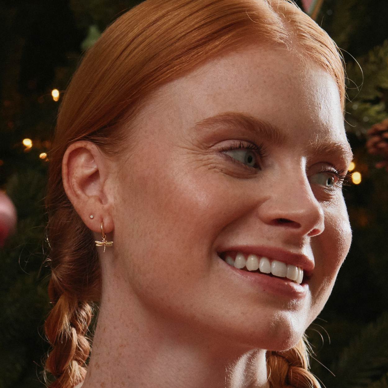 Teeny Tiny Dragonfly hangs from a lightly textured huggie hoop, designed to be worn solo, as a pair - or mixed and matched. Handmade in London in solid 18ct Yellow Recycled Gold. Come with gold butterfly back.