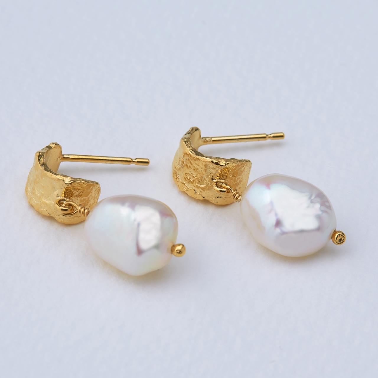 A.M. Textured Bark Huggie Hoop Earrings with Baroque Pearl Drops Gold