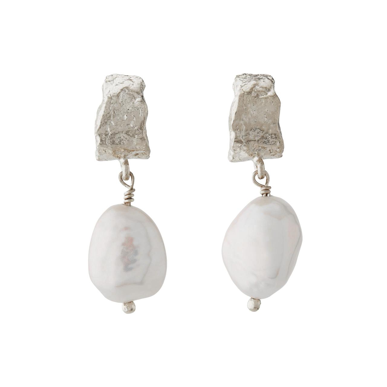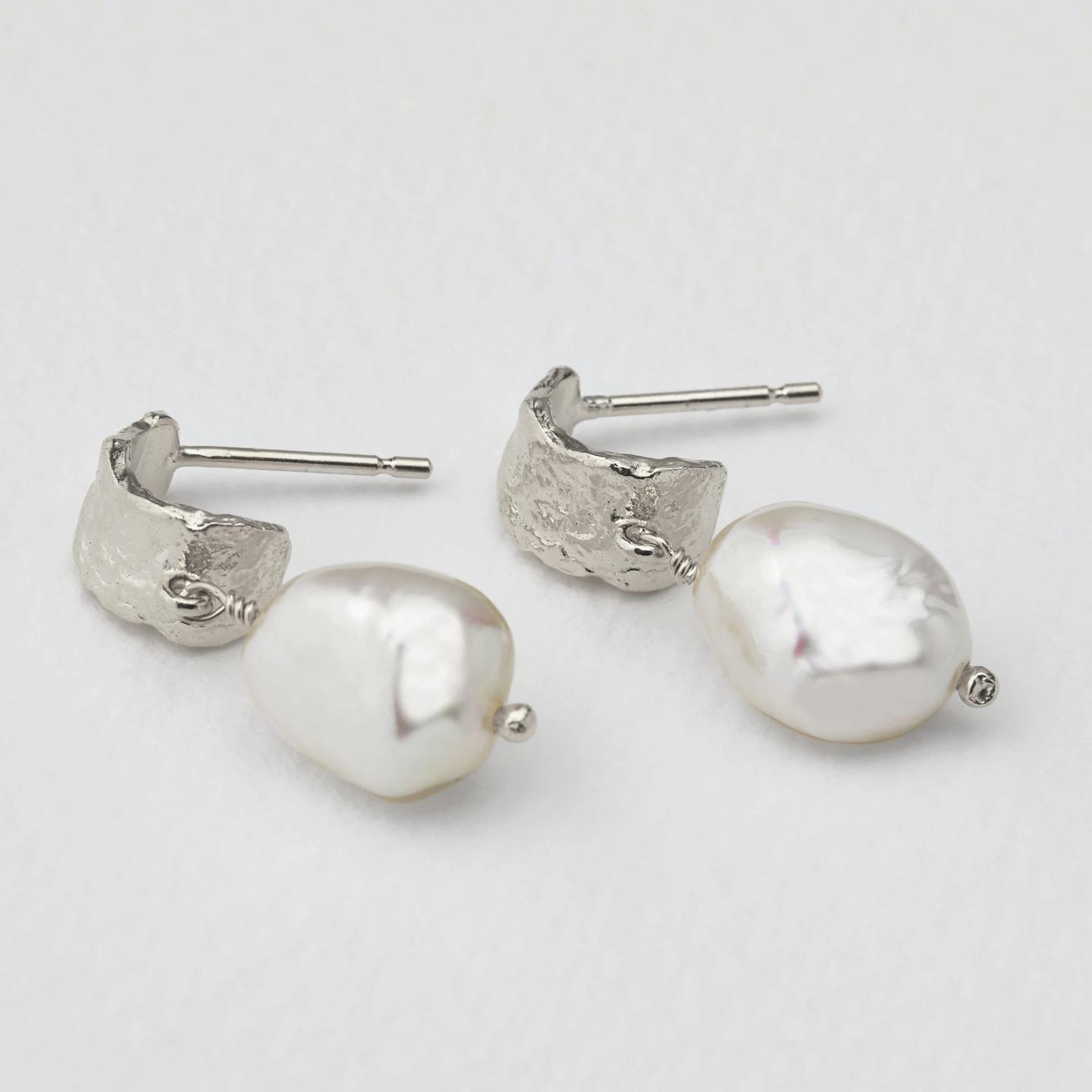 A.M. Textured Bark Huggie Hoop Earrings with Baroque Pearl Drops Silver