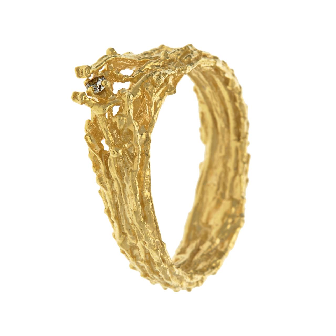 Celebrating the sculptural beauty of nest structures, a layered twig ring features a precious champagne diamond nesting at its pinnacle!