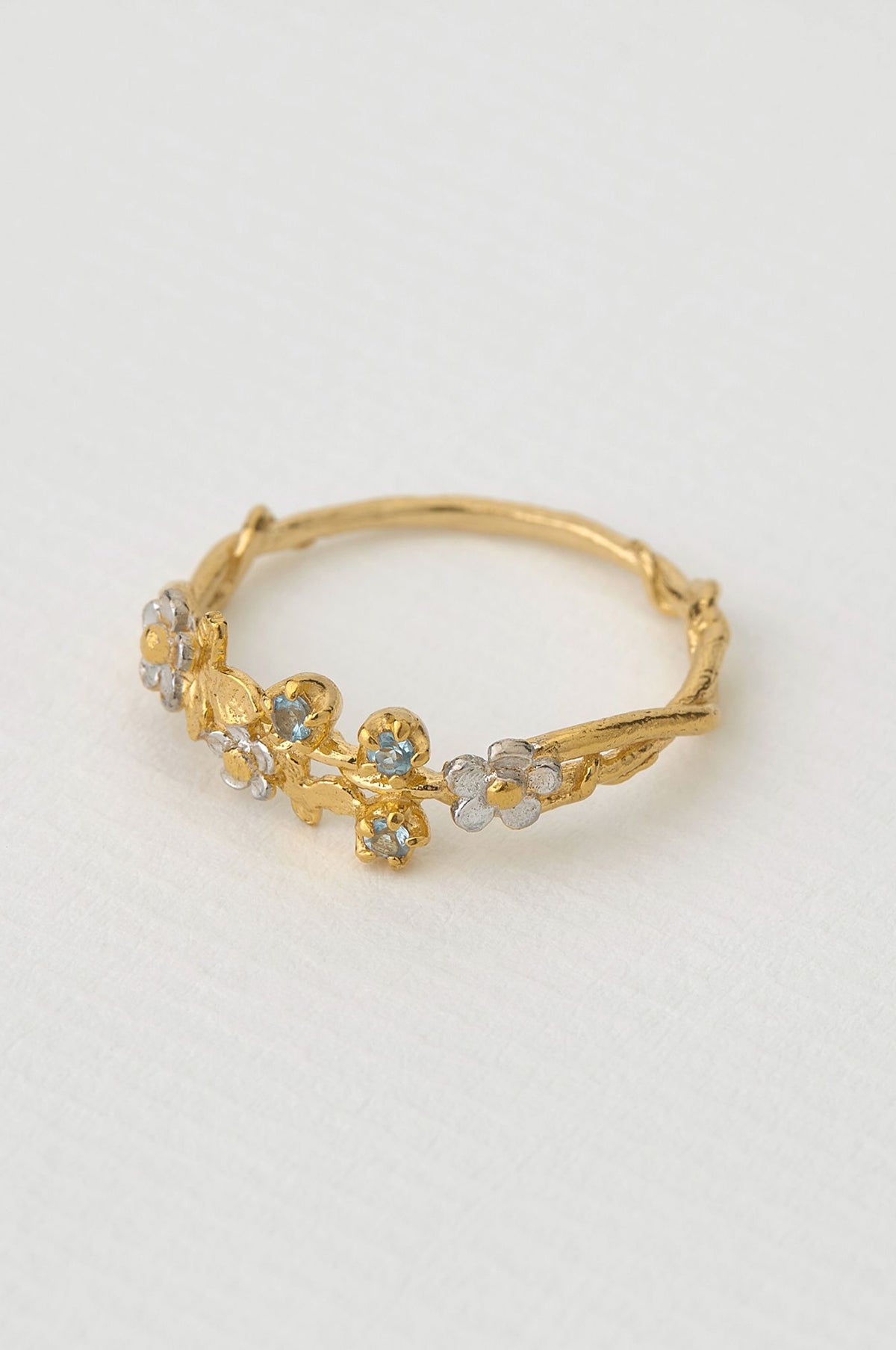 A delicate vine twists to form a unique ring, blooming with flowers and accented with three luminescent topaz stones. This is a pure, wild-hearted summer's dream of a piece of jewellery. Available in 2 ring sizes: UK L and UK M.
