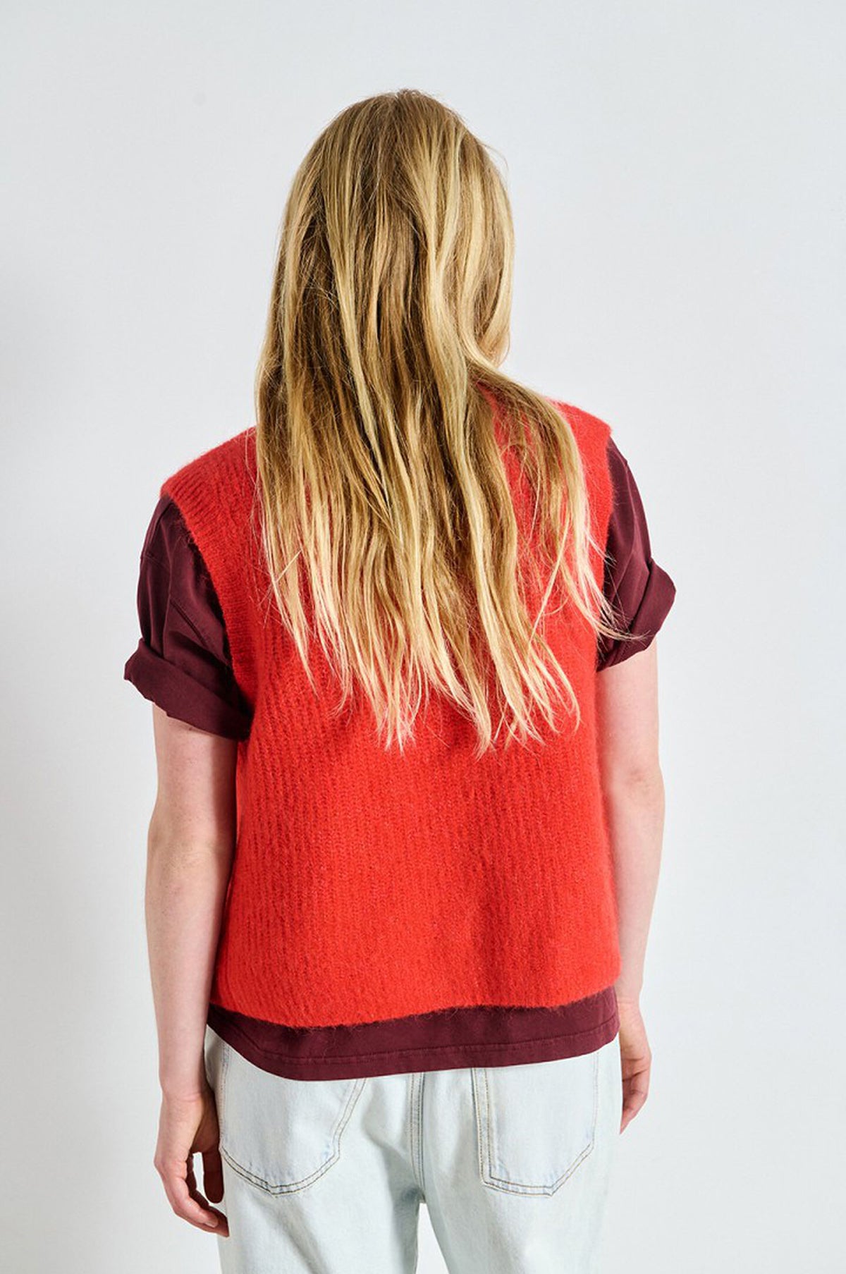 Add a little panache to any outfit with this jaunty red knit vest from American Vintage. With its fluffy texture, crew neck, ribbed detailing, and mother of pearl buttons this vest is ideal for layering. Slightly oversized with a boxy silhouette it sits beautifully on top of dresses, skirts, and trousers.