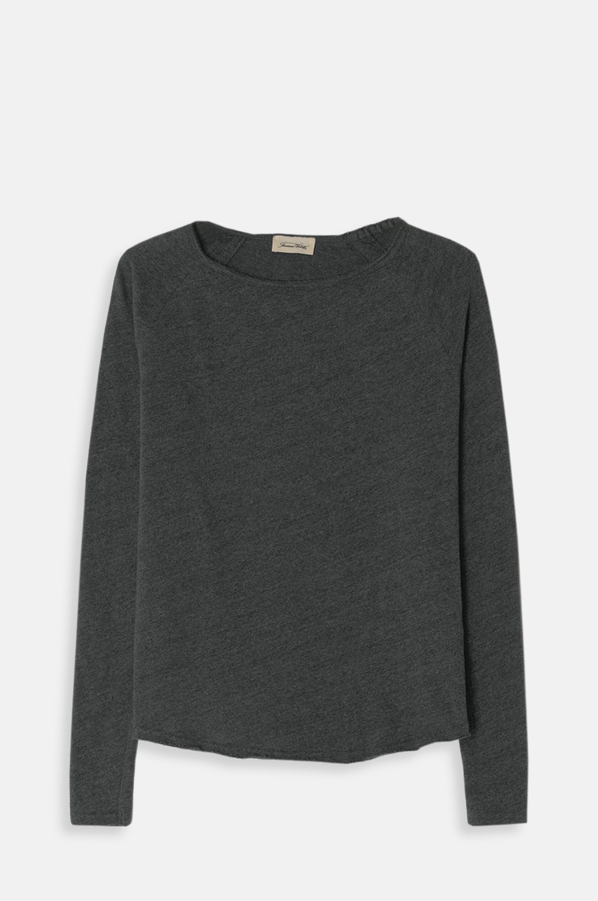The Sonoma is another American Vintage classic. Slightly thicker than a tee, but less so than a sweat, this is the perfect between season layer that will become invaluable. It has a flattering boat neckline and long, raglan set sleeves. The mid-weight fabric is very slightly textured and the edge left with raw beyond the hems for a more casual aesthetic. This is the Vintage Black colour which is a slightly faded/ washed shade of black.