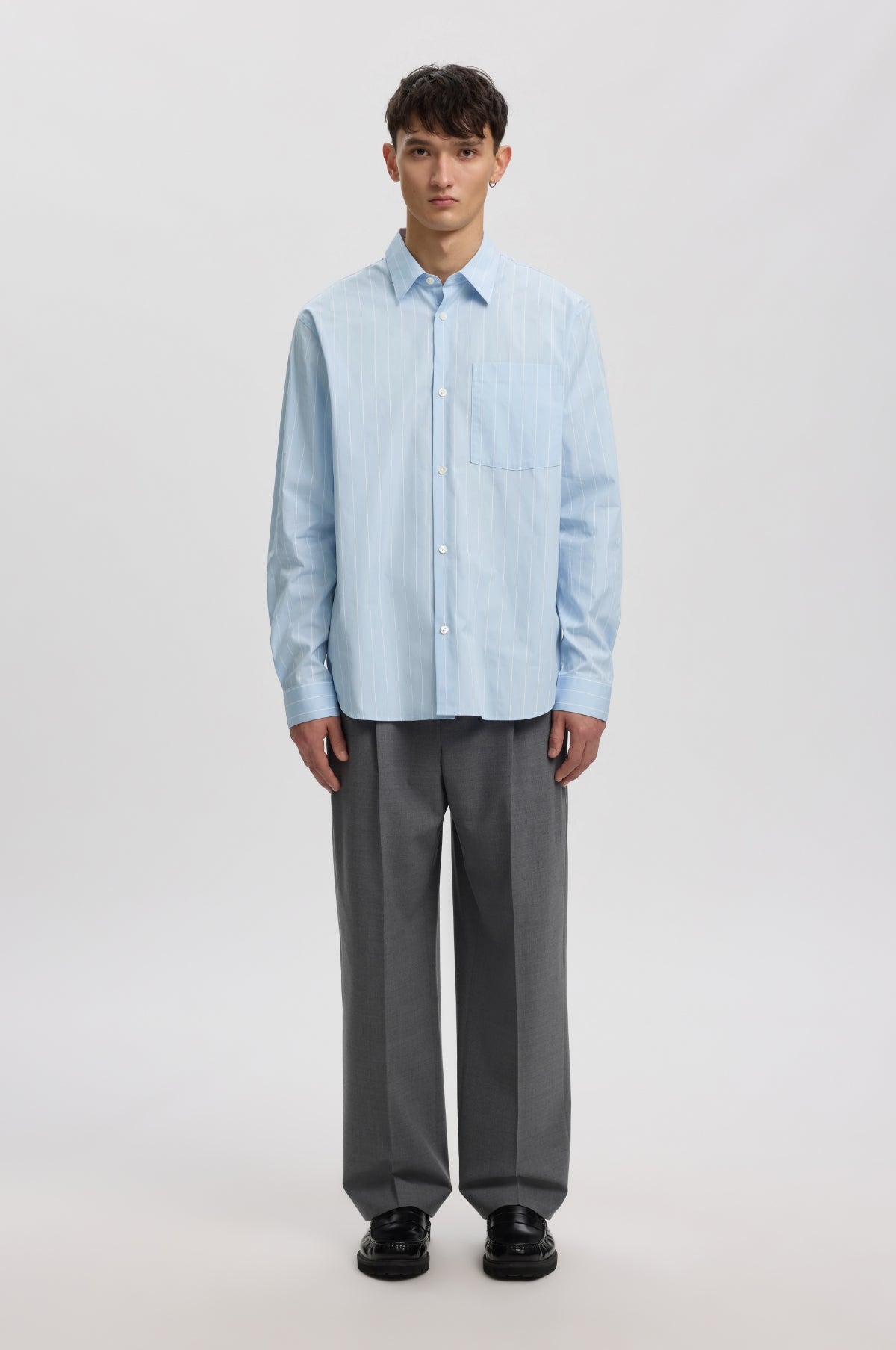 Brand new for SS26, Annarr offers a purposeful selection of tomorrow's essentials that balance contemporary tailoring with the spirit of street and everyday workwear. The Anraslund Mix Oxford Long Sleeve Shirt in Cashmere Blue is a classic oxford shirt with a stripe design and a single chest pocket.