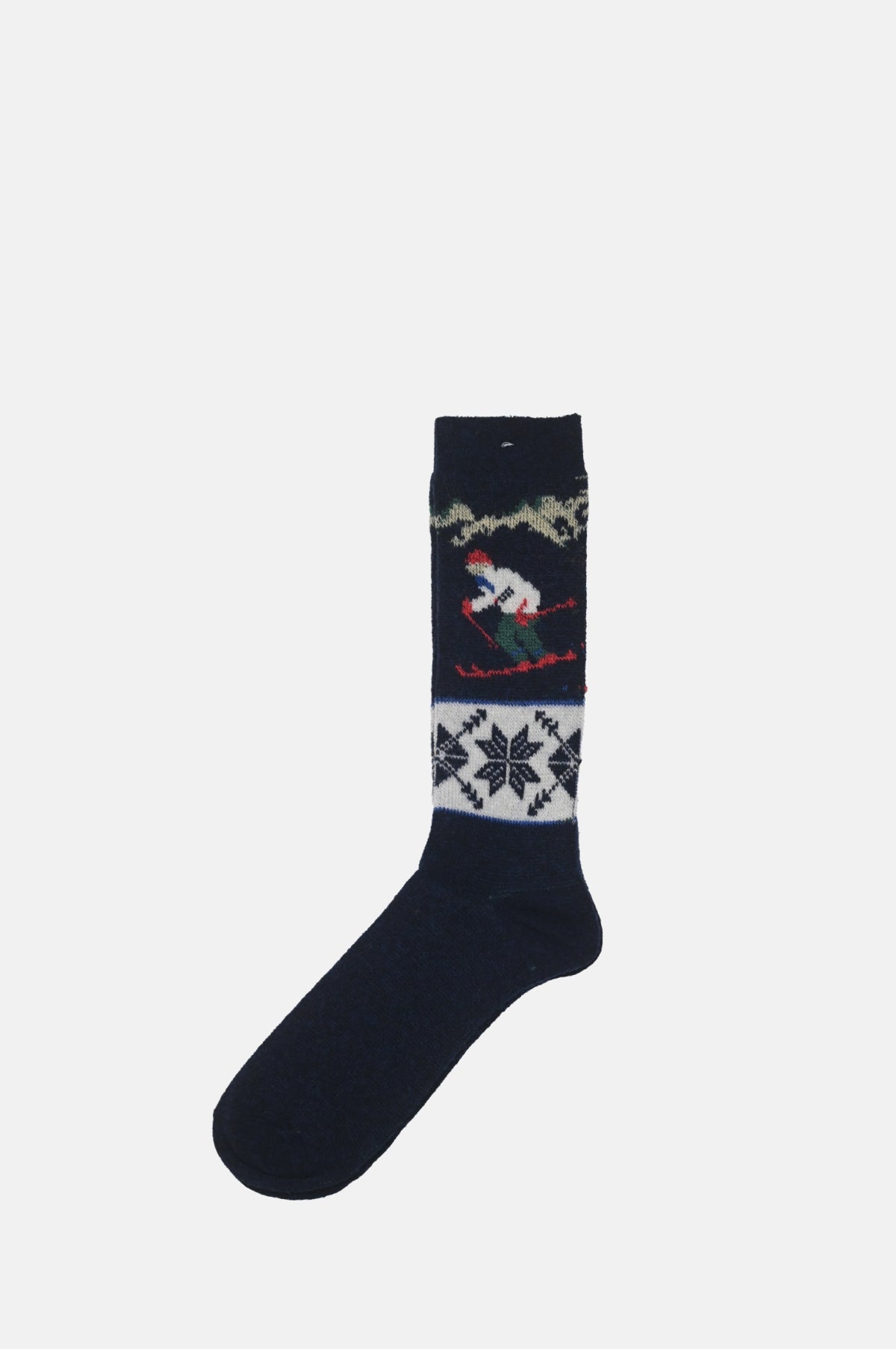 Made from a blend of warm wool blend, the Wool Ski Jacquard Crew Socks in Navy features a playful winter-themed jacquard knit with a skier and a snowflake pattern on a solid navy base. This sock is designed for superior winter warmth and a unique, sporty-yet-traditional look, perfect for après-ski comfort. Crafted in Japan for superior comfort and durability.