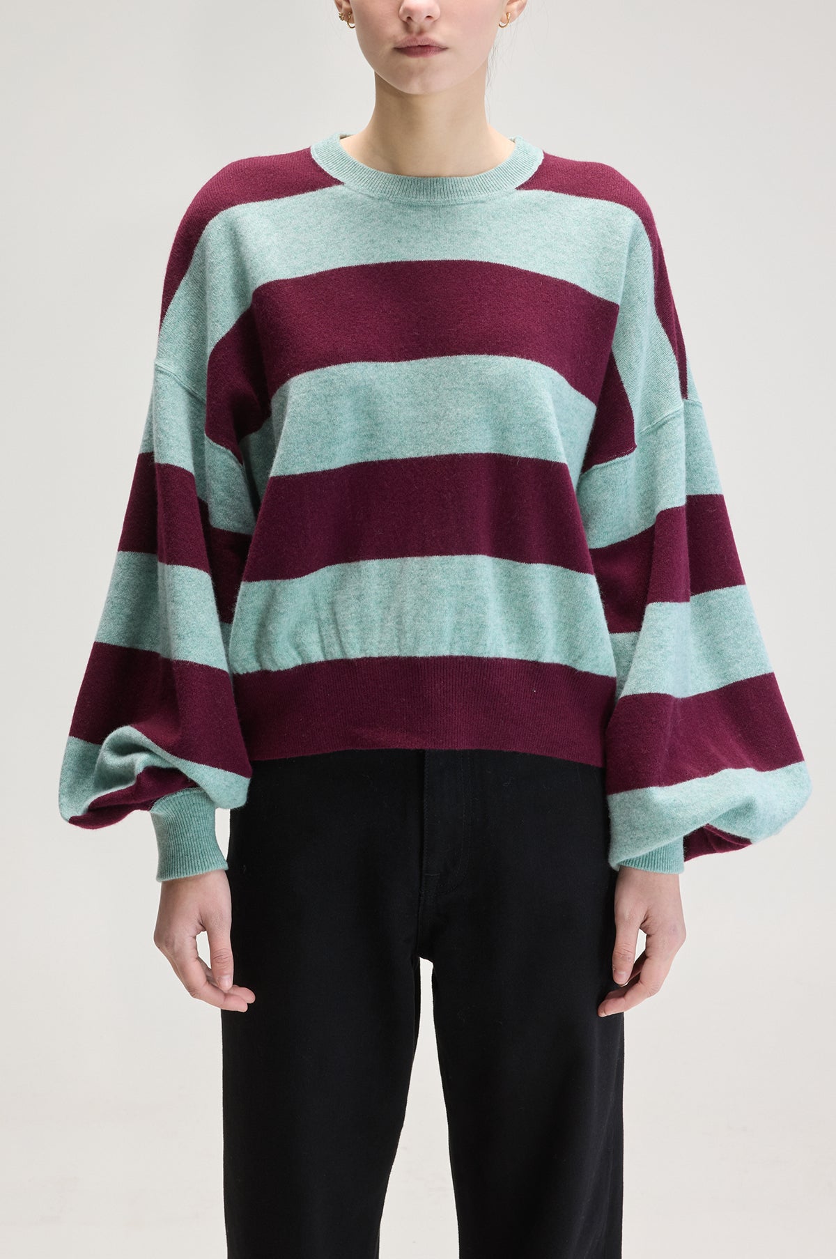 In a delightful robin's egg blue and aubergine stripe, this medium weight woolen jumper from Bellerose will breathe fresh life into tired autumn wardrobes. With its slouchy shape and blousy sleeves that are gathered at the wrist, it has a floaty silhouette that sits perfectly on top of denim.