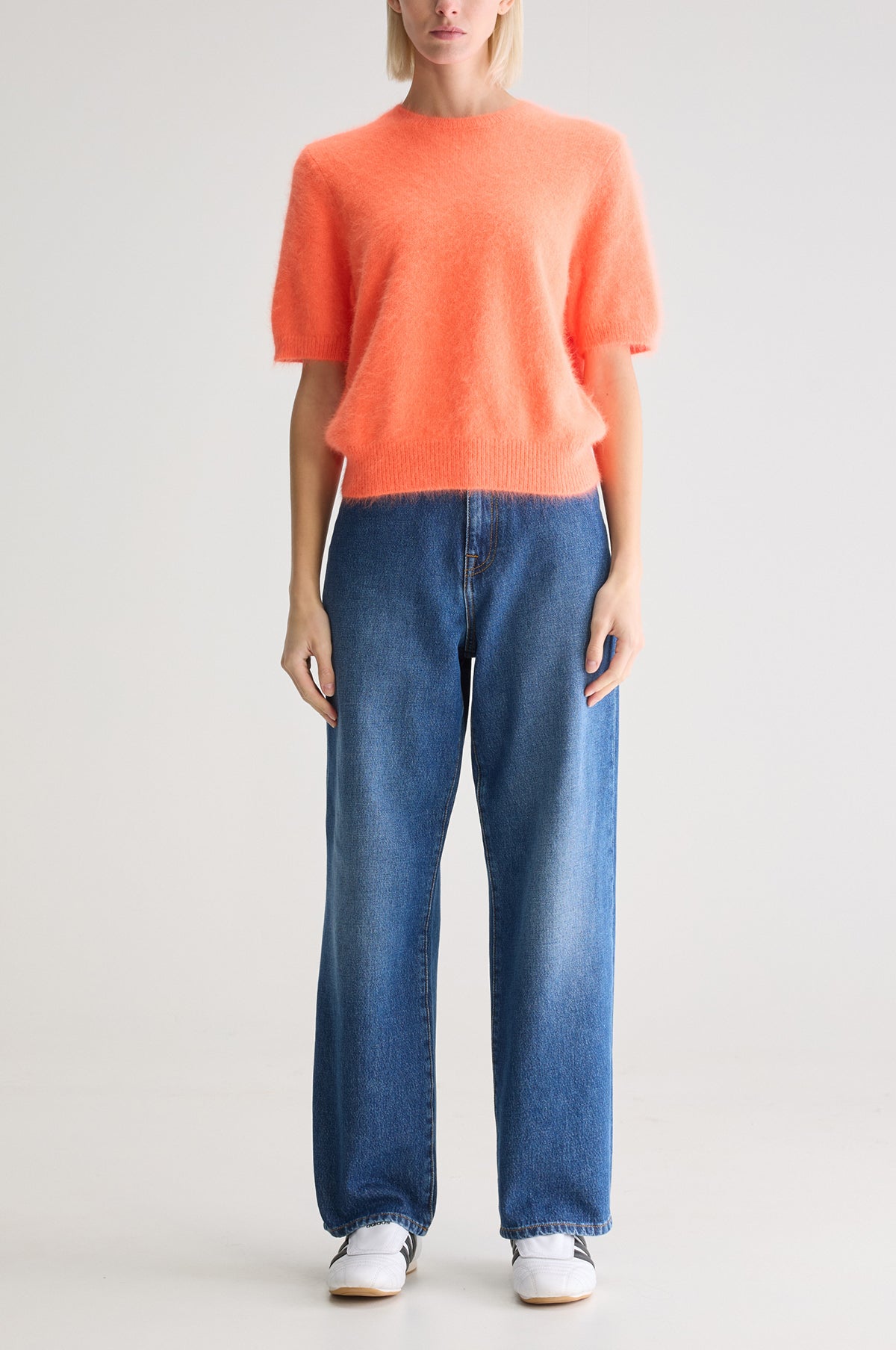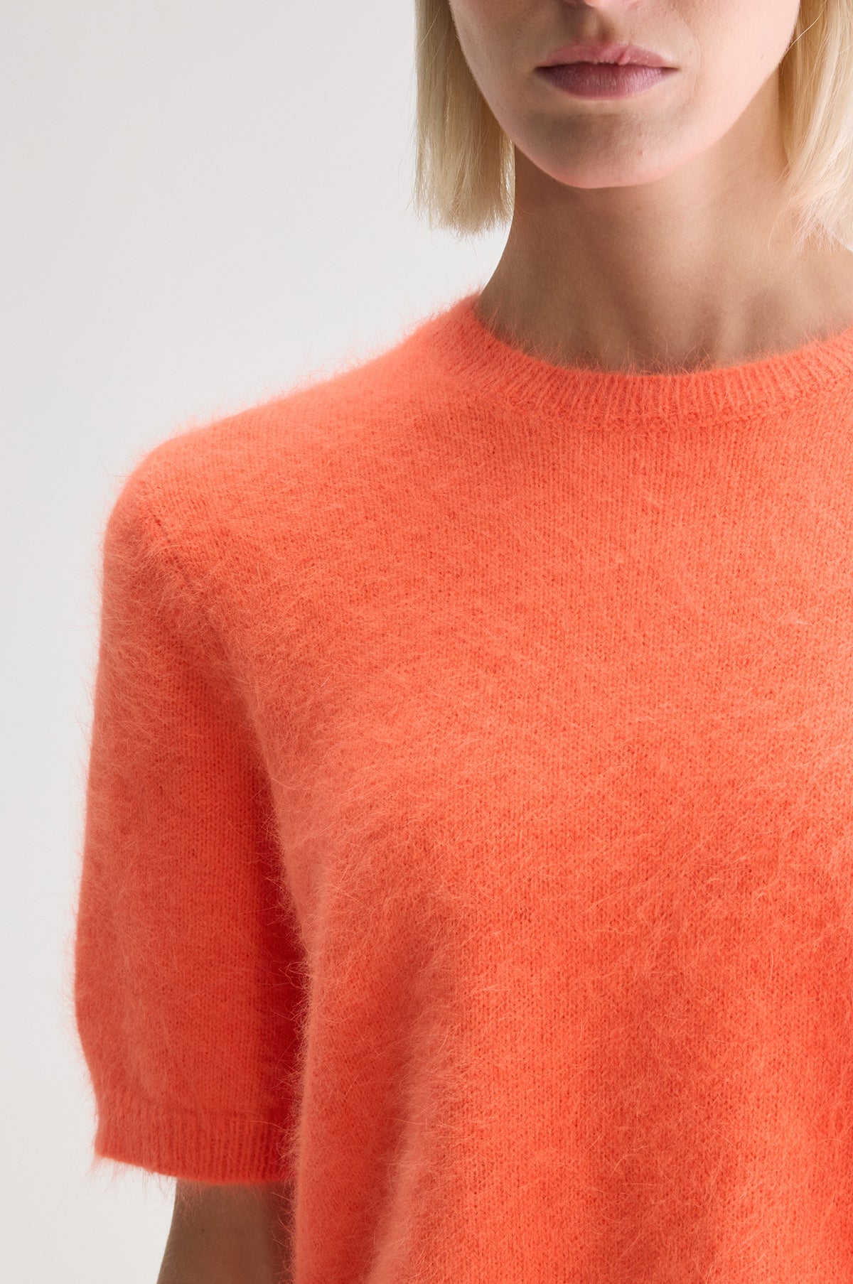 This bright orange short-sleeved jumper from Bellerose will brighten any wardrobe. Made from an angora blend, this fluffy knit is lightweight and soft to the touch. With its slim fit, round neck, and ribbed hem it is a flattering choice for any occasion.
