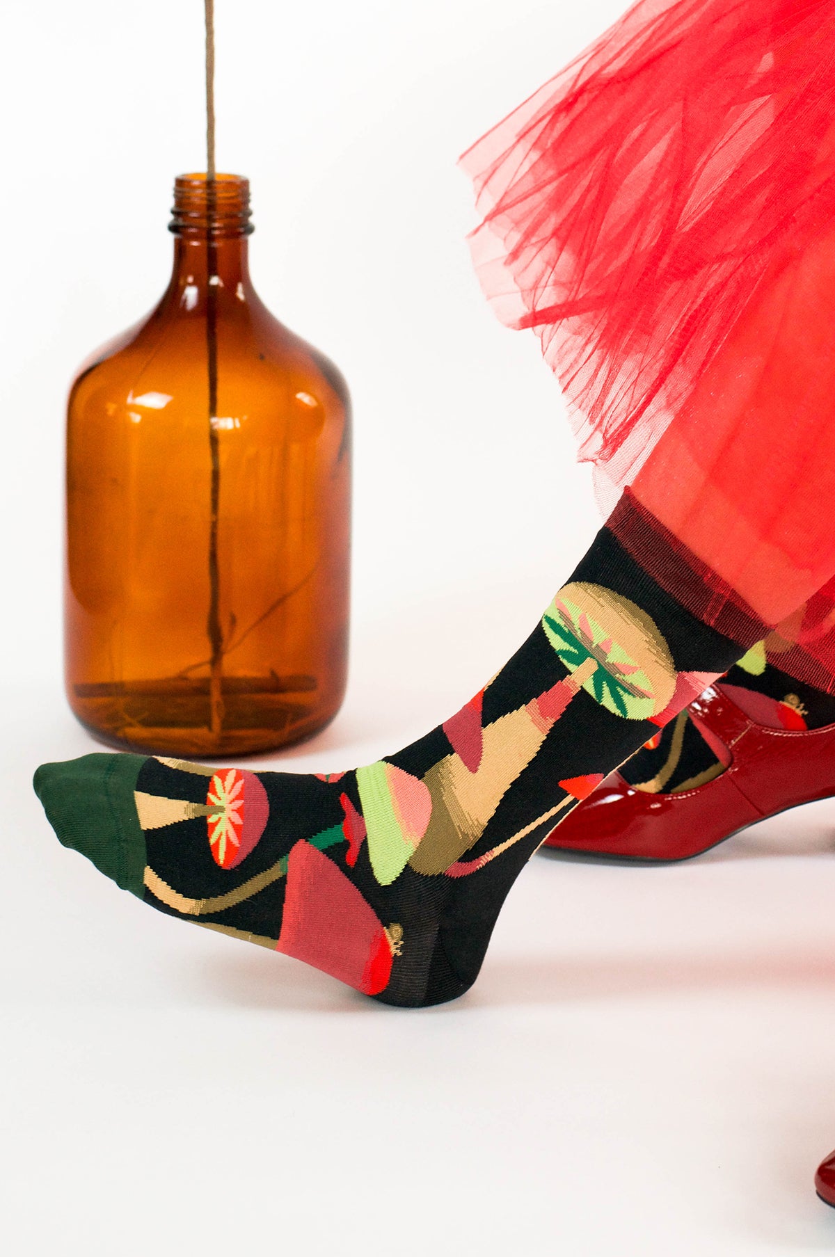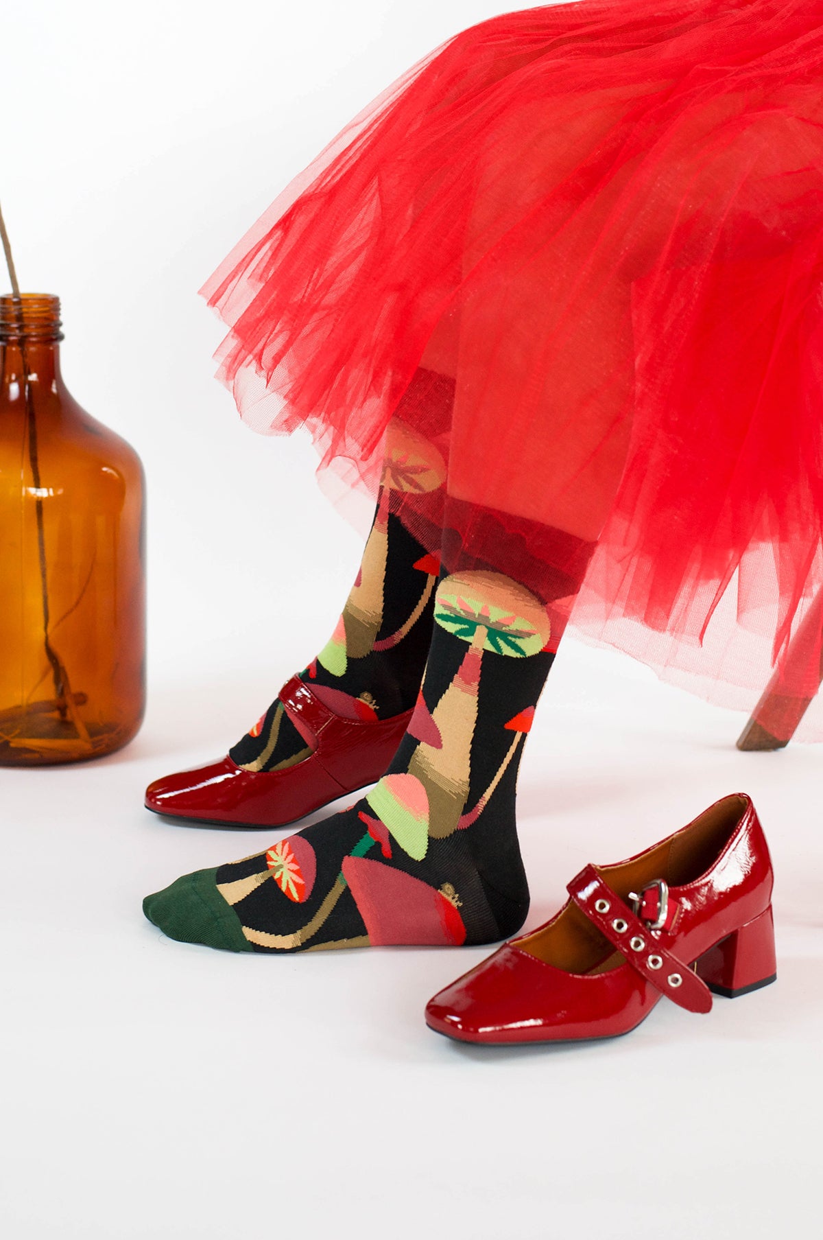 Bonne Maison are fabulous at designing socks with imaginative patterns. This pair are woven in black and adorned with a colourful mushroom print. Finished with a dark green toe.
