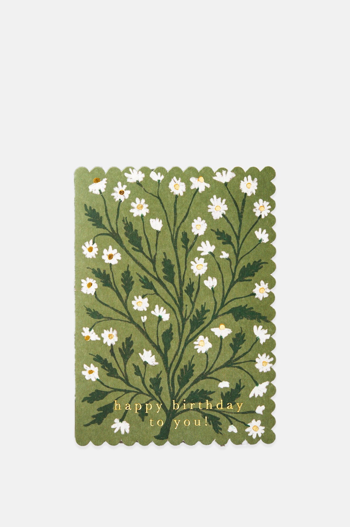 Part of our very favourite Flora collection from Wanderlust, this birthday card features a die cut scalloped edge and beautiful all over daisy print in green and cream, with gold foiled floral centres. Comes with a luxury green envelope.