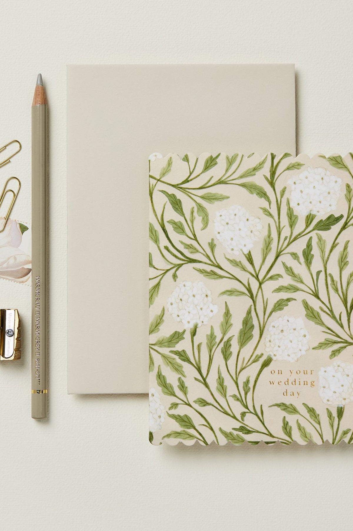 Celebrate their happily ever after with this beautiful floral card that they can cherish for a lifetime. Featuring a white and green floral print, it is finished with a scalloped edge and a gold foiled message that reads "on your wedding day".