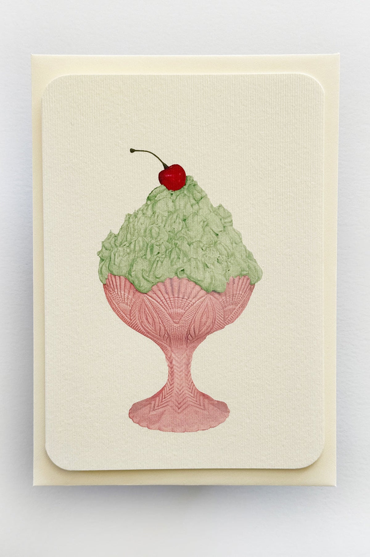 Printed and hand-finished in England using luxurious Italian-milled paper, this sweet greeting card features a photograph of Pistachio Chantilly Cream. Almost good enough to eat, this retro-inspired notecard is reminiscent of Victorian promenades on the seaside collecting shells, relaxing on the sand, and eating glassfuls of ice cream topped with Chantilly cream. A charming way to send a handwritten note, we've bought the whole set.