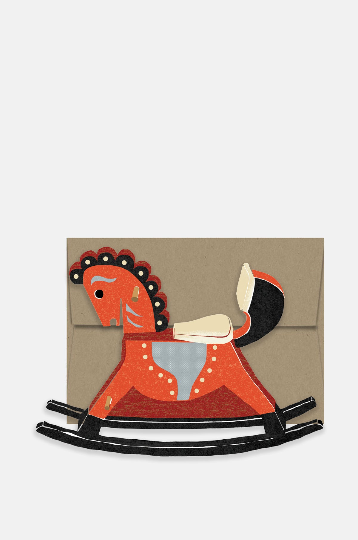 This delightful cut out Rocking Horse card is great to send for a child's birthday or to celebrate the arrival of a new baby. This shaped card is great to frame or add to a pinboard or collage.