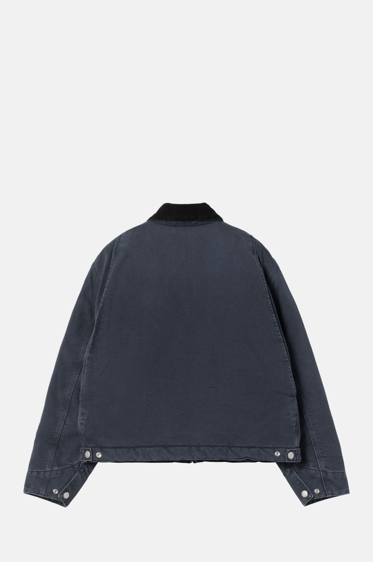 The Women's OG Detroit Jacket is made in their original loose fit from heavyweight cotton Dearborn Canvas, featuring a diamond-quilted lining. A corduroy collar, chest pocket and a front zip closure offer tactile touches, while triple-stitch details provide extra durability. A woven Square Label on the chest completes the design. This piece is a Carhartt icon and this season comes in Dark Navy with a Black collar.