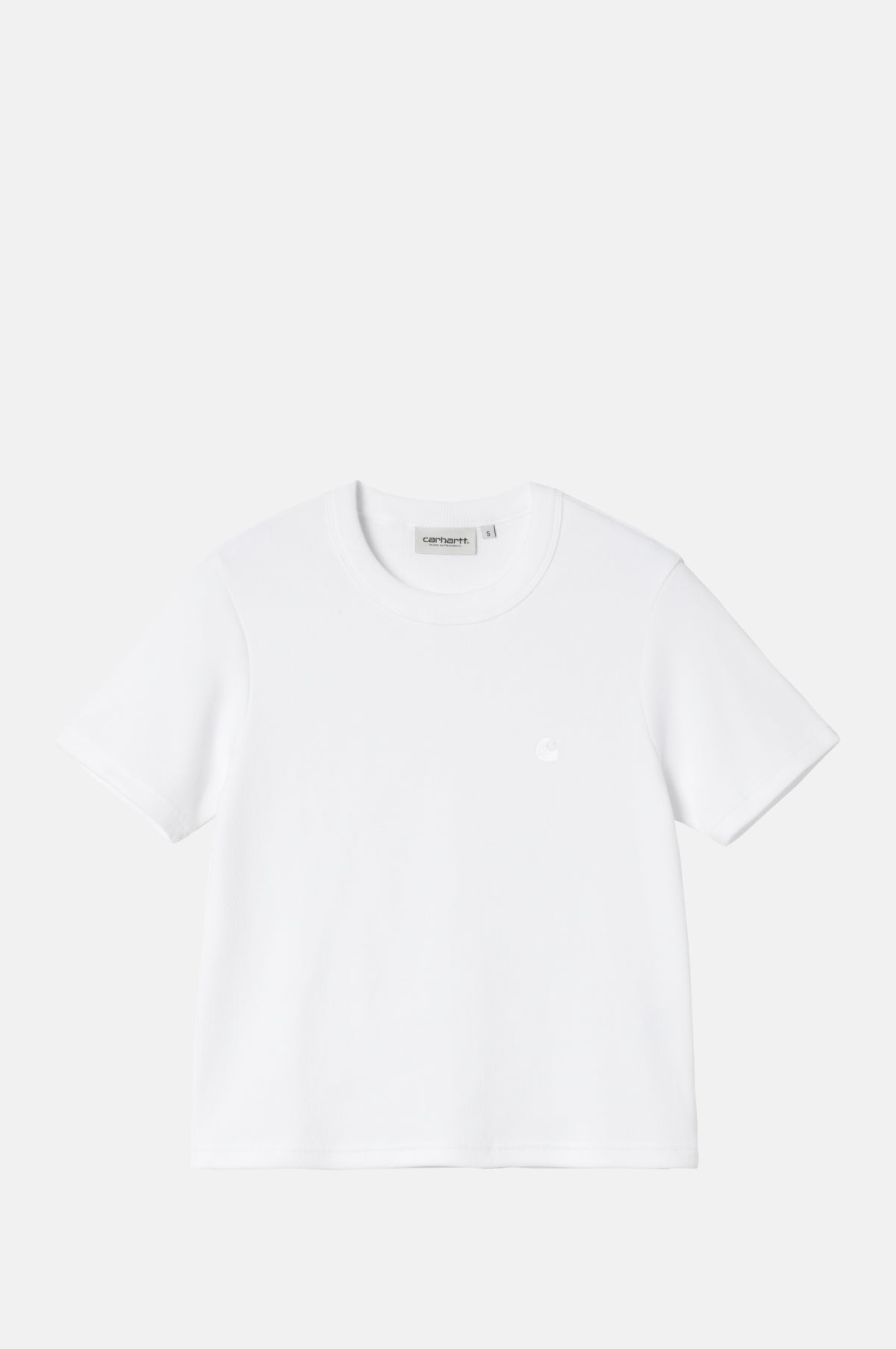 A classic white ribbed baby tee from Carhartt WIP,  featuring a slim silhouette, round neckline, and short sleeves. Perfect for layering or wearing on its own with jeans and your favourite trainers.