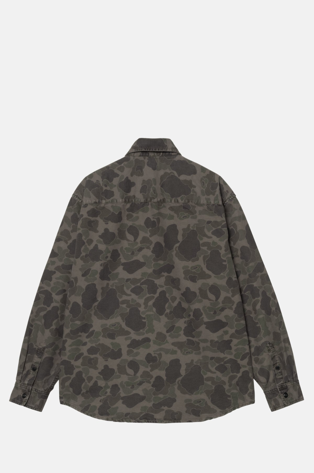 The Duck Shirt in Camo Duck Green is made in a loose fit from midweight cotton canvas featuring an all-over camouflage print. The item has also been garment-dyed for a softer feel and complex colour configuration. A woven square Carhartt WIP label appears on the chest pocket.