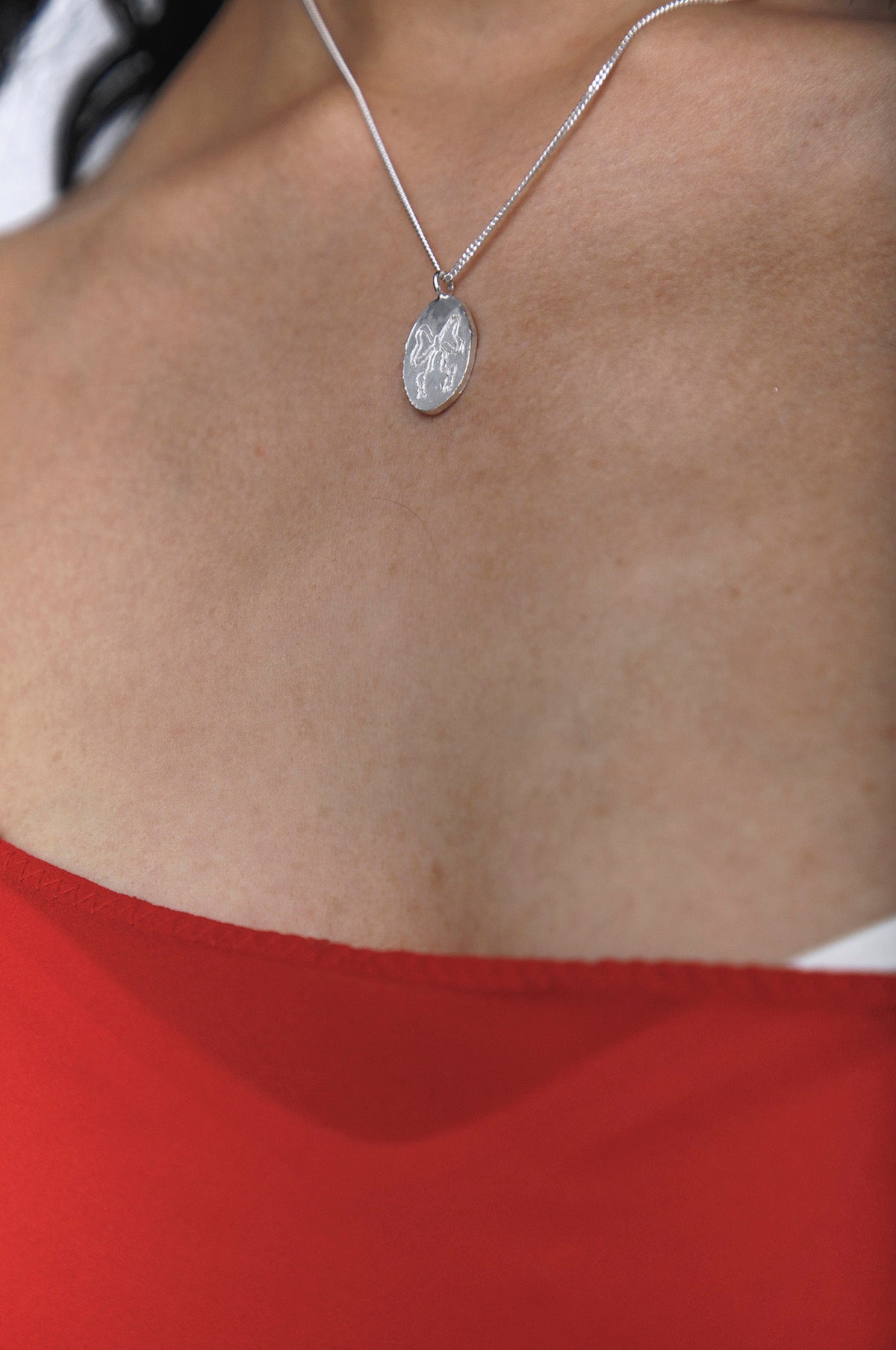 This charming silver double sided pendant necklace has a delicate bow etched on one side and a bouquet of flowers on the other. This sweet necklace makes a lovely everyday piece.