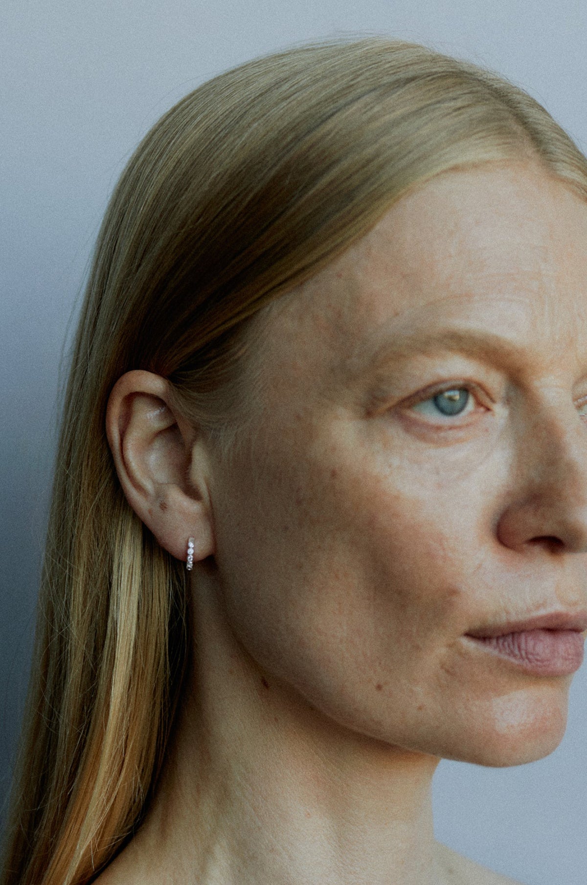 A pair of silver hoops with a string of shiny white brilliant-cut CZ stones going from the front of the ear and ending behind the ear. Classic and elegant.