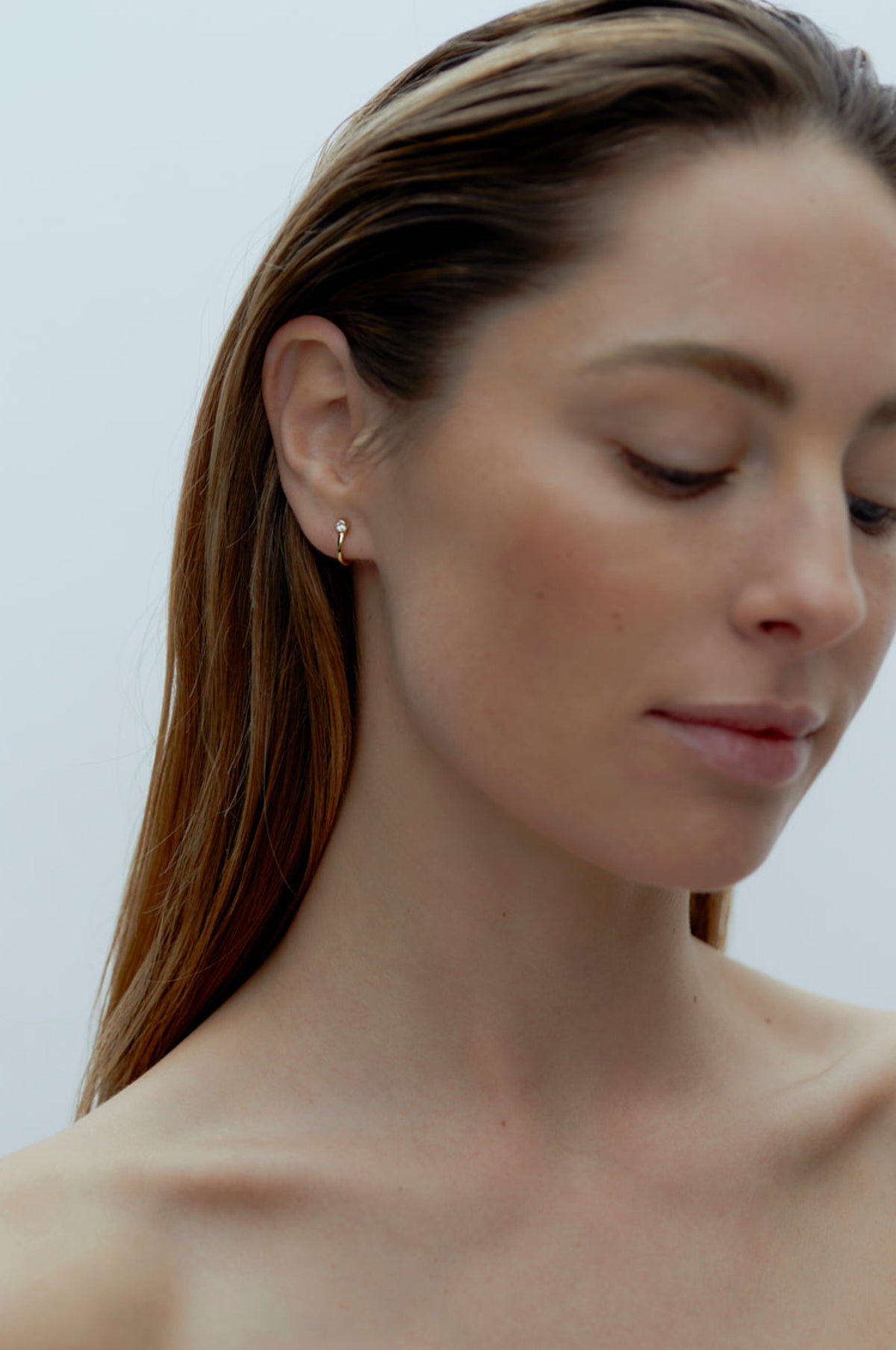 A pair of earrings in 18k gold plated 925 sterling silver with a beautiful floating stone set at the top. These earrings exude simplicity and elegance and are perfect for everyday wear..