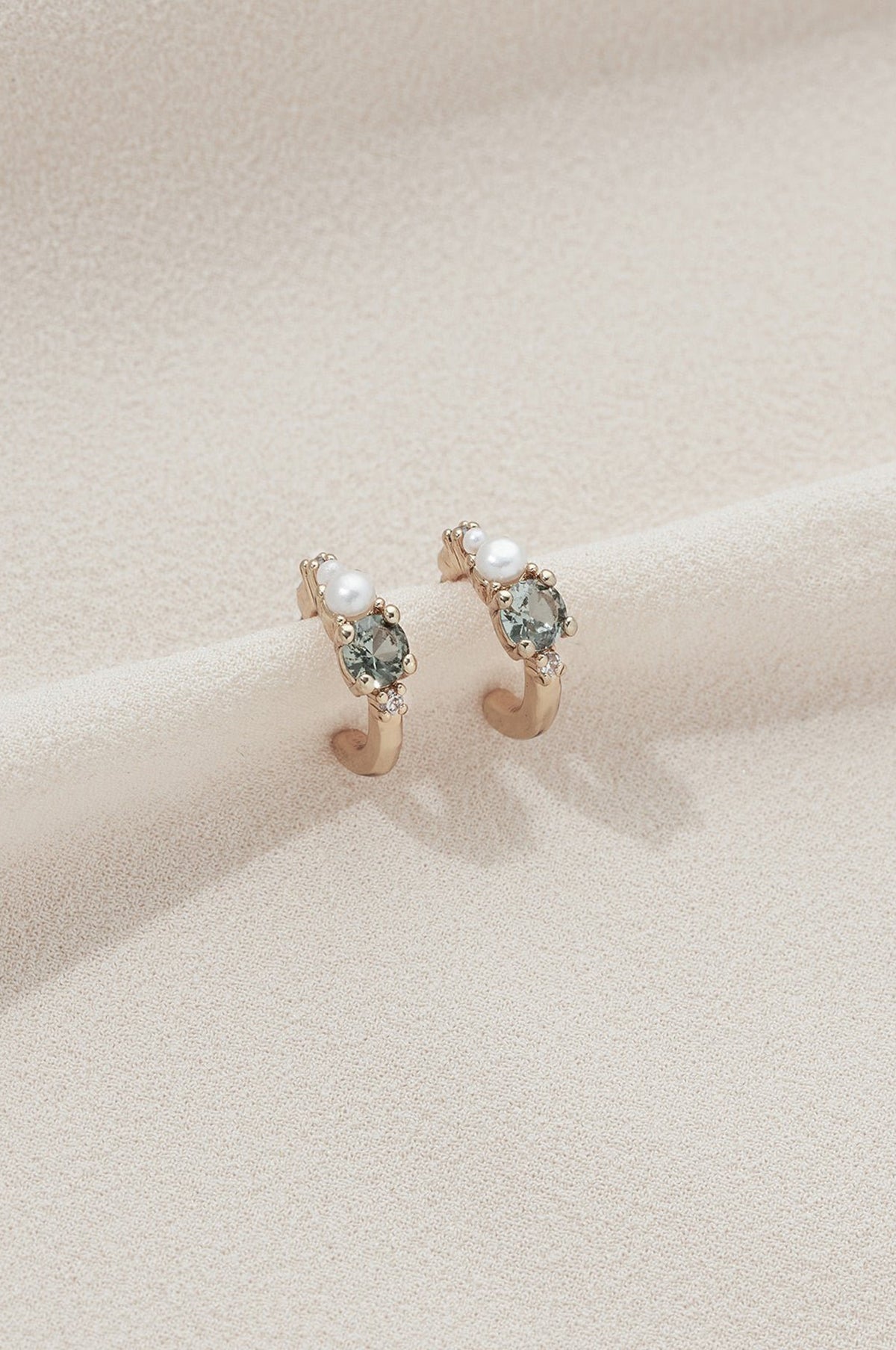In an elegant line these small gold-plated hoops feature an alternating mix of crystals and pearls with one central green hued gem. Turn heads in all the right ways and take your look to the next level with these versatile earrings.