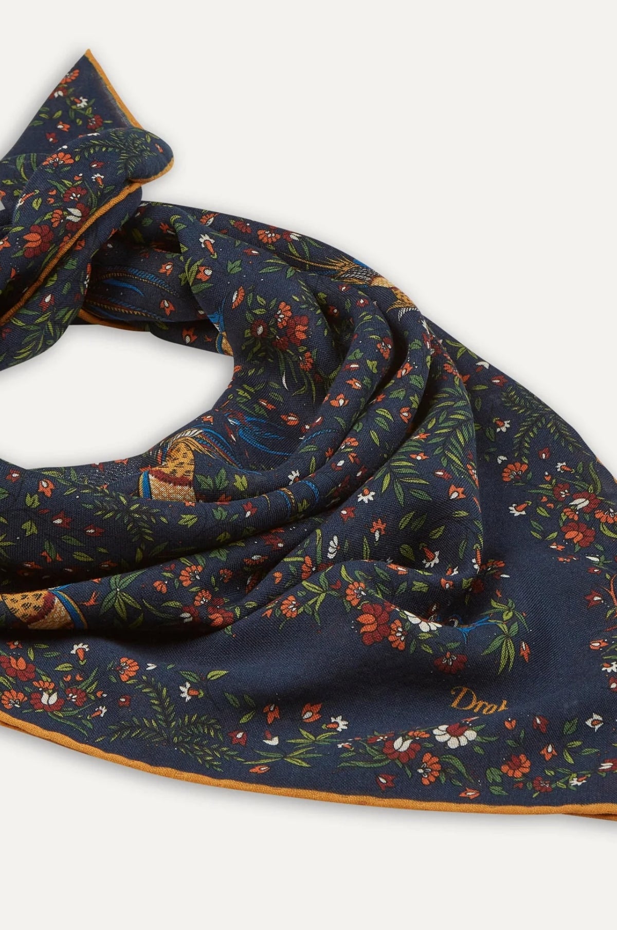 Taken from their extensive design archive, this birds of paradise motif has been vividly applied to a blend of pure wool and silk for a elegant and comfortable defence from a cold snap. The base colour of this scarf is navy with the floral pattern being made up of orange, red, green and blue.