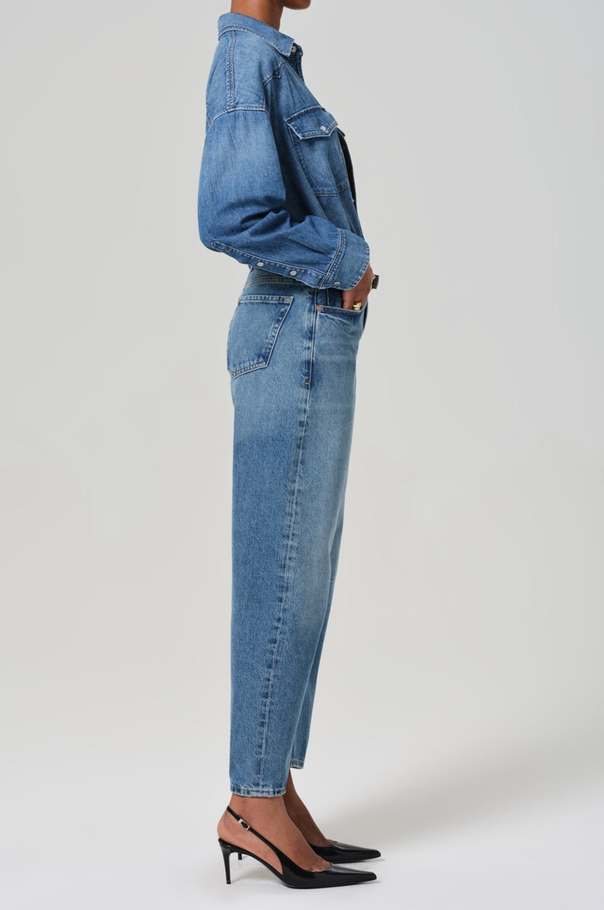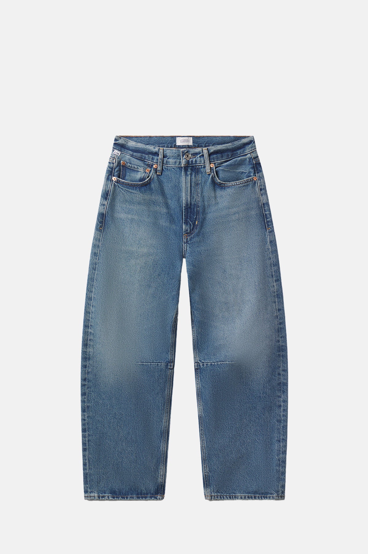 A premium denim label from Los Angeles, Citizens of Humanity have committed themselves to producing the highest quality denim without compromise. Exuding a sophisticated ease, these jeans are a refined take on the barrel silhouette. Sitting high on the waist they have a relaxed taper through the leg. Cut from a rigid regenerative cotton, they are a medium shade of indigo, soft to the touch and have subtle fading and whiskering. Pair with crisp shirting or a minimal knit for effortless polish.