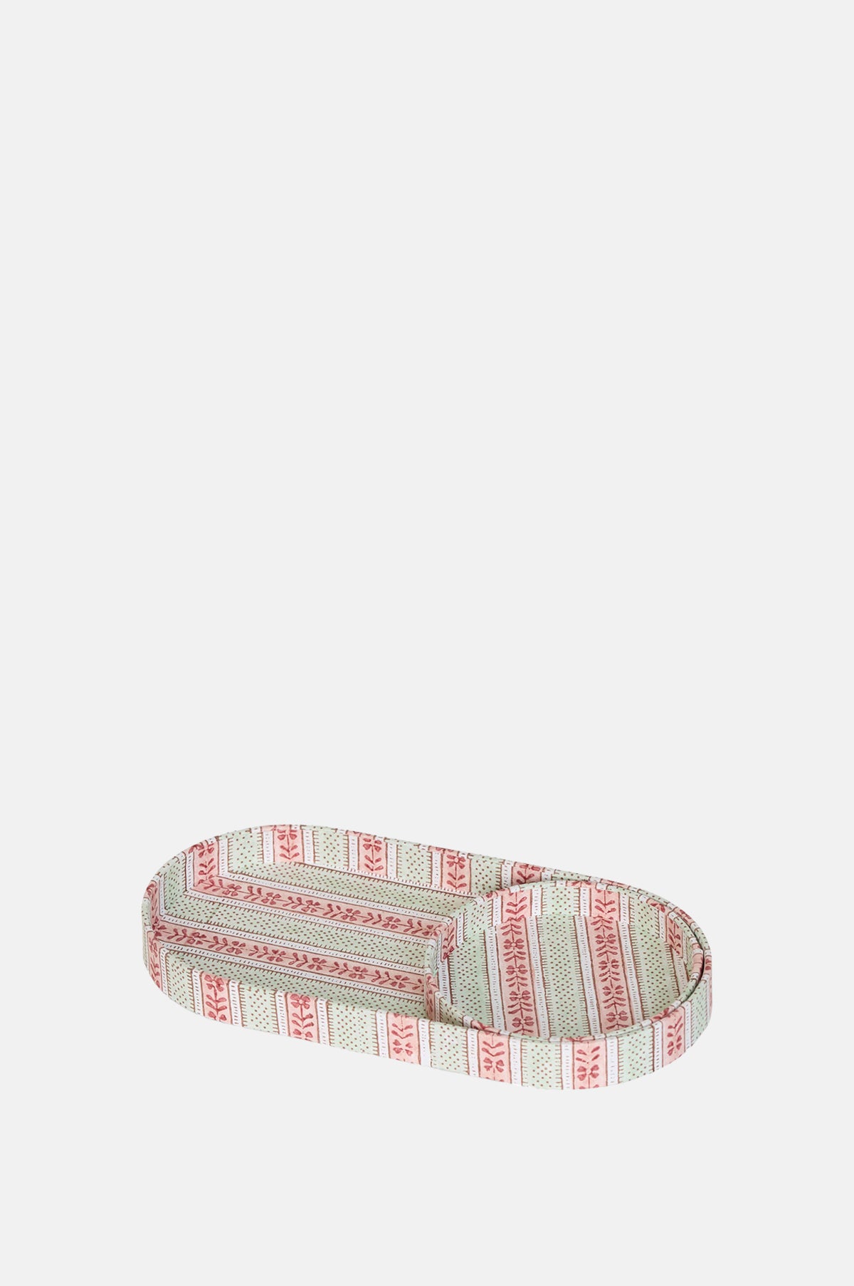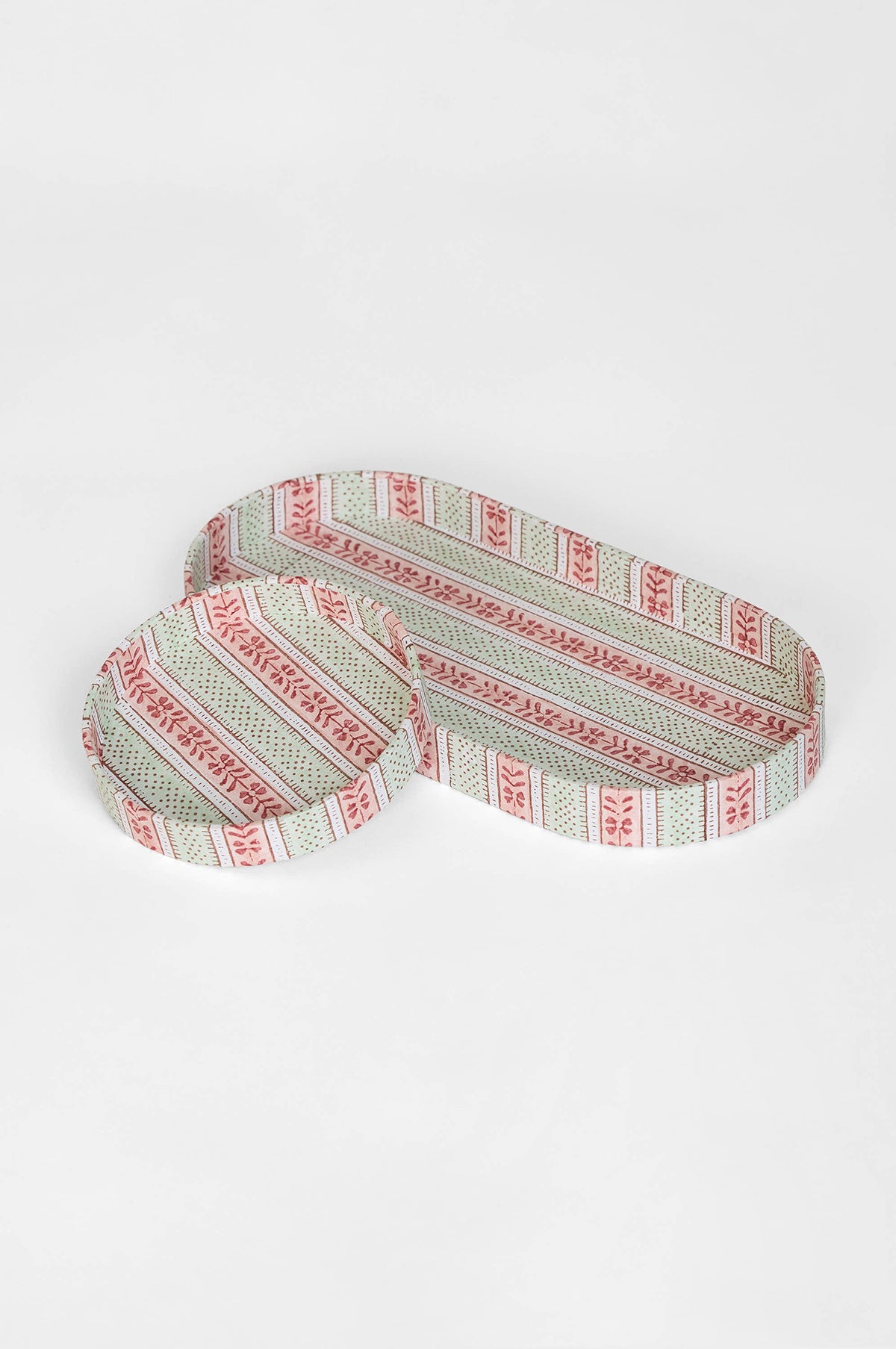 Craft Boat recycled cotton paper trays are handmade by master artisans who have been creating vintage style boxes and cartonage products for generations in Jaipur. This beautiful paper design featuring a mint green and rose pink striped floral pattern has been hand block printed. This set of two nested trays will add an elegant and practical Victorian touch to your desk spaces, living rooms, or the table next to your front door. Perfect for extra pencils, small notes, keys or little charms.