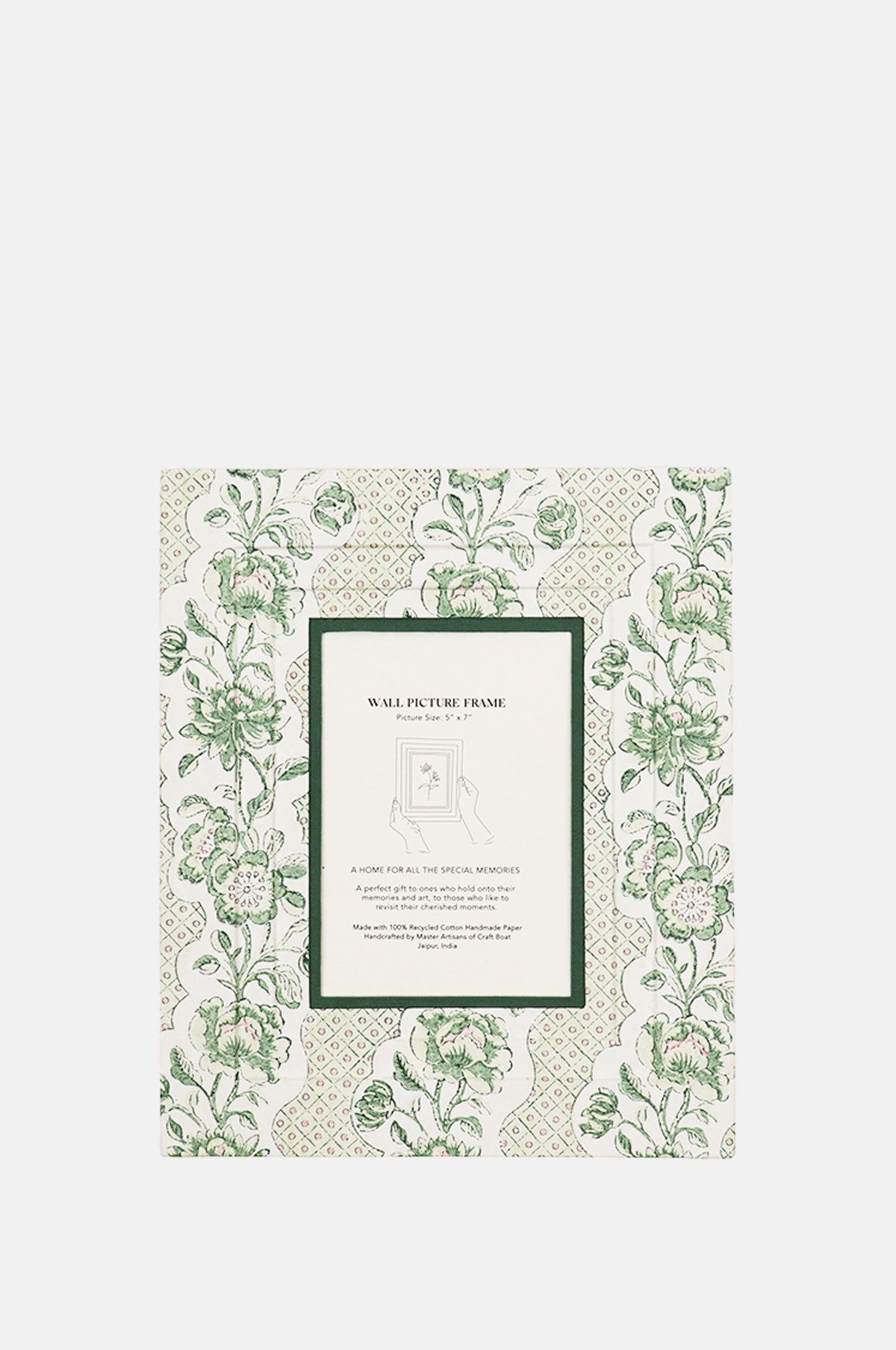 Craft Boat recycled cotton wall picture frames are handmade by master artisans who have been creating vintage style boxes and cartonage products for generations in Jaipur. This beautiful paper design featuring a trellis pattern of green blooms has been hand block printed. This would make a perfect gift for those who hold onto and display their memories and art, to let them revisit their cherished moments.