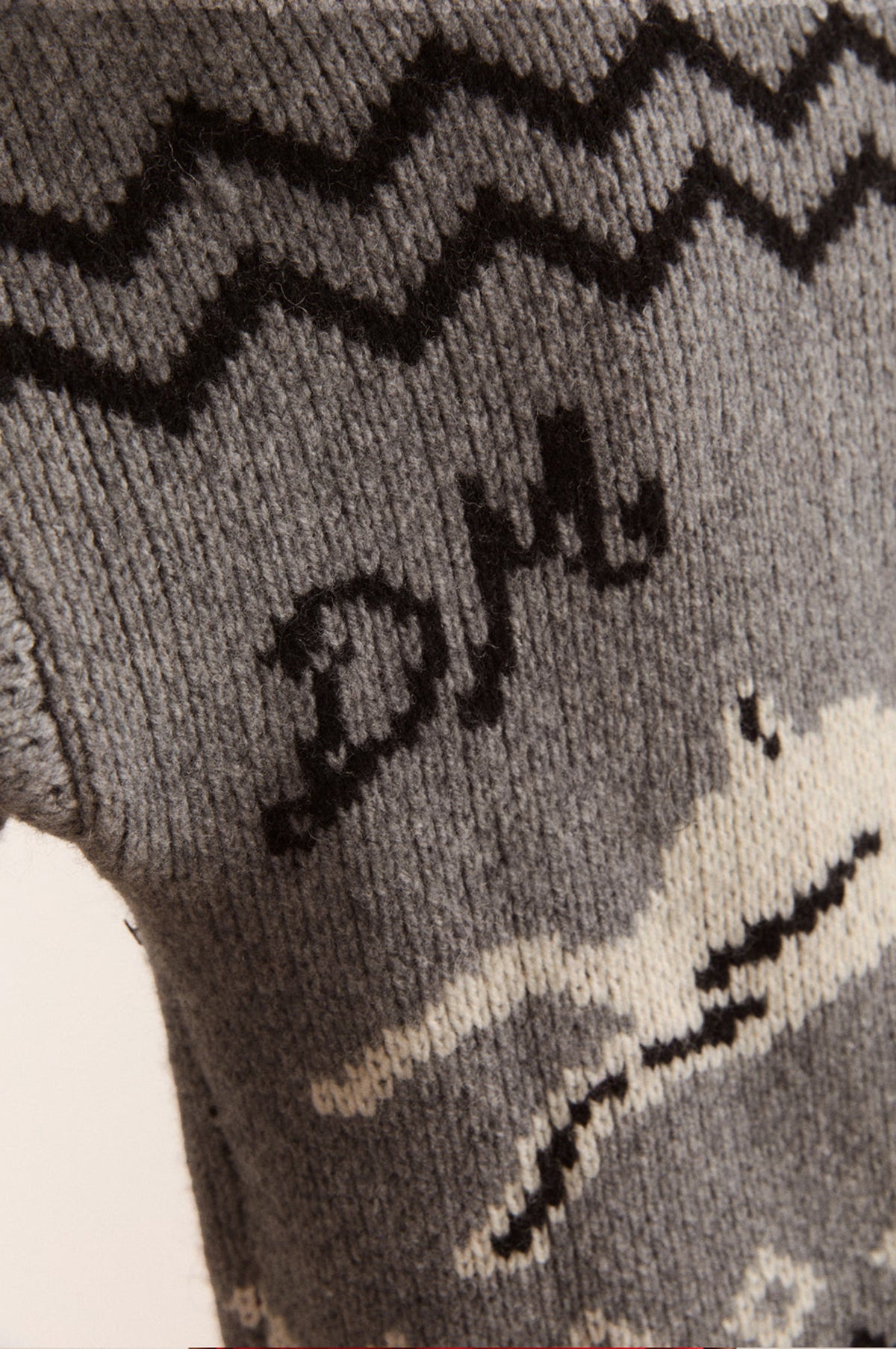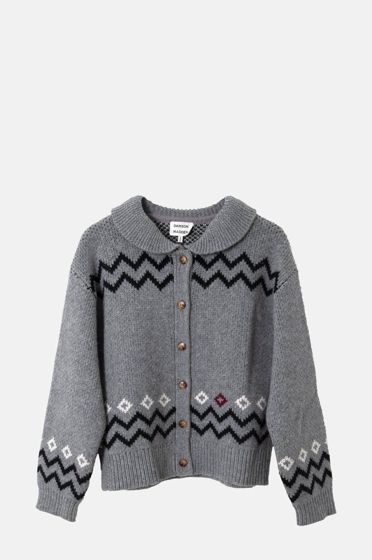 Adding a touch of eccentric whimsy to staple knitwear, the Cecily cardigan offers casual elegance. Designed for a contemporary boxy fit, this heavyweight grey cardigan features a leaping bunny motif on the back, in addition to a contrasting black and white diamond and zig zag pattern which runs around the knit. A peter pan collar and ribbed cuffs and hem finish the design.