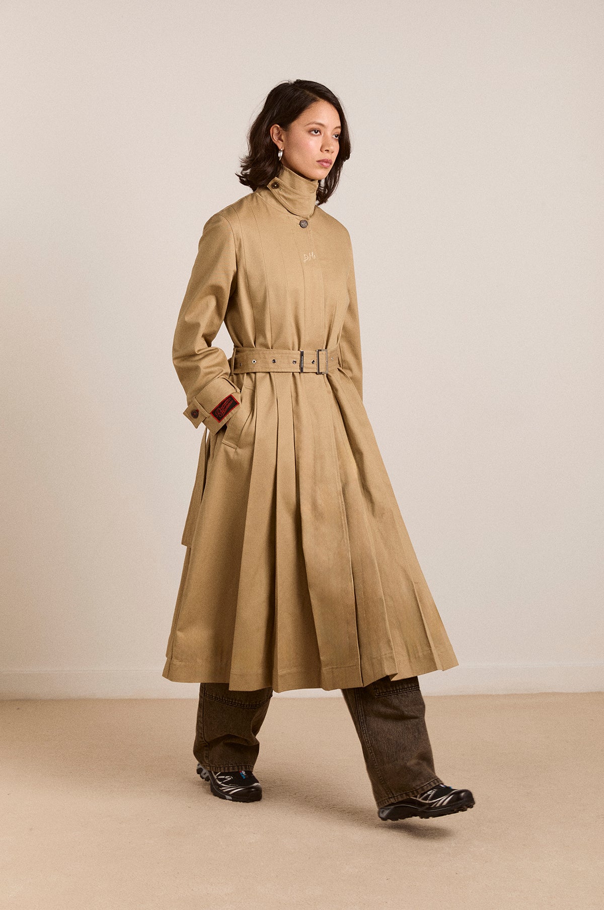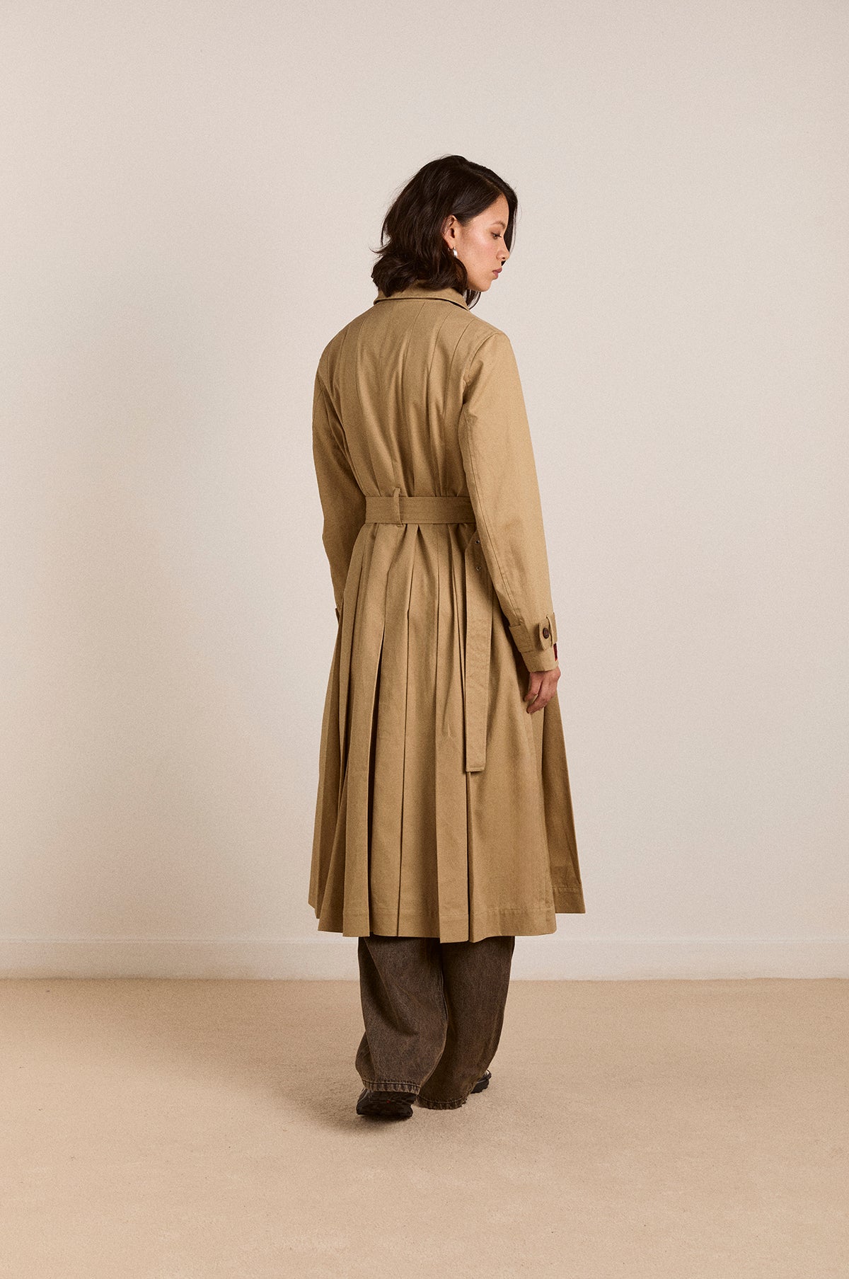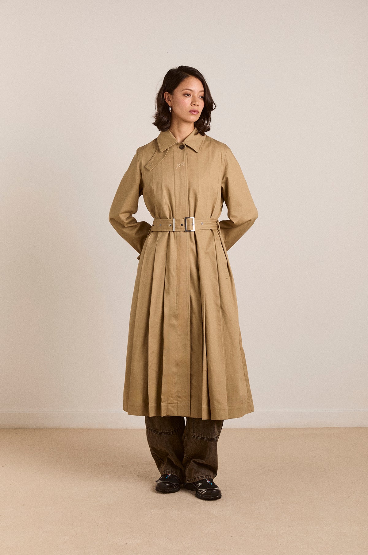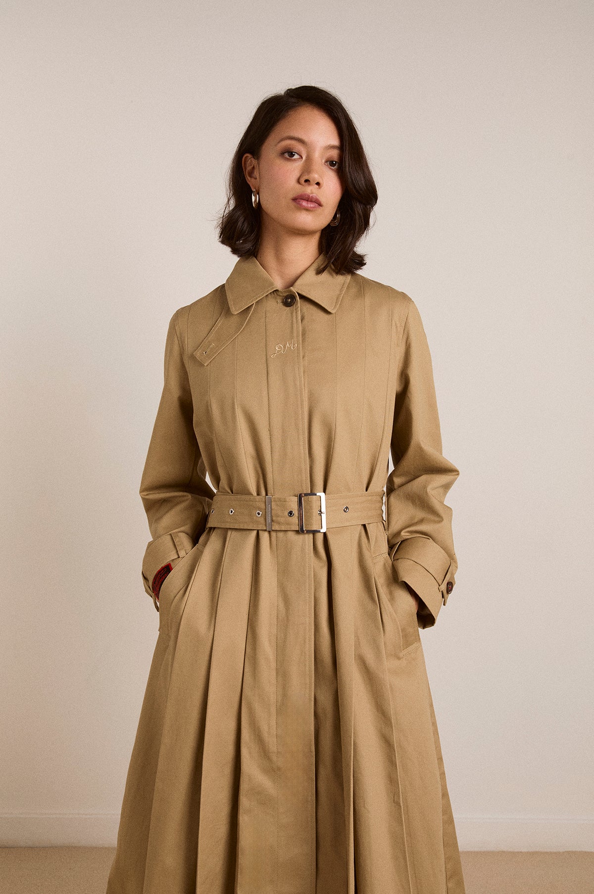 Damson Madder delivers a refined trench coat with the Sofia Pleated Trench which features a fully pleated midi-length design that moves beautifully with you. Rendered in a classic tan colour it is finished with silver-tone hardware, including a statement buckle and eyelets on the adjustable belt, and a contrast buttonhole stitch detail on the sleeve for a subtle pop of character.