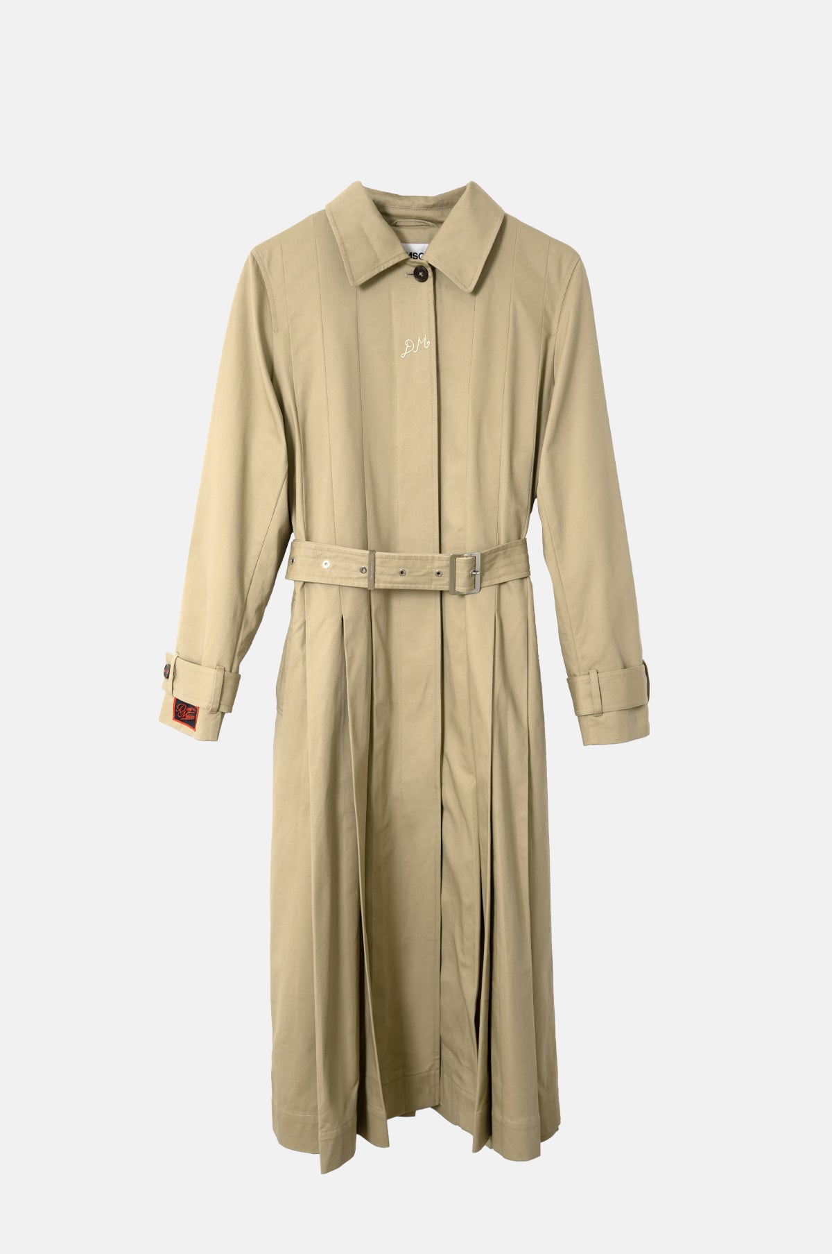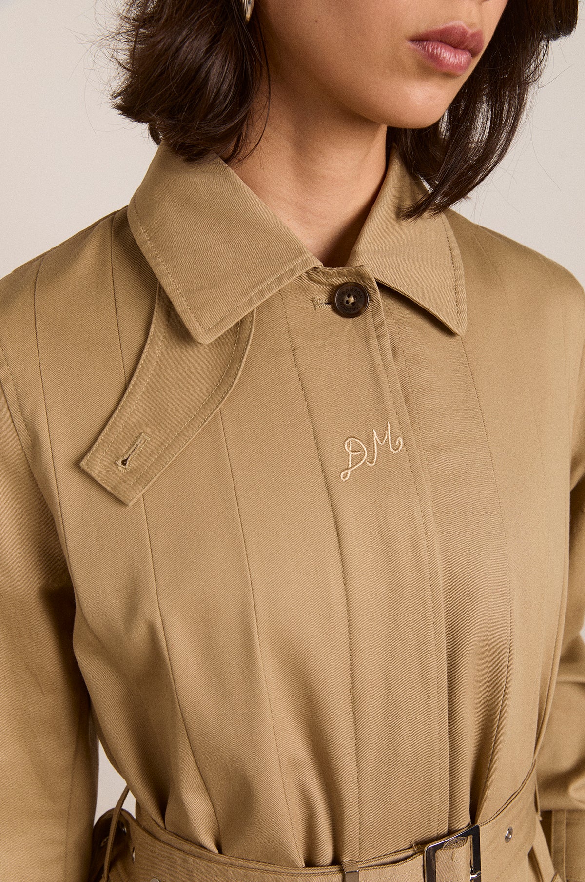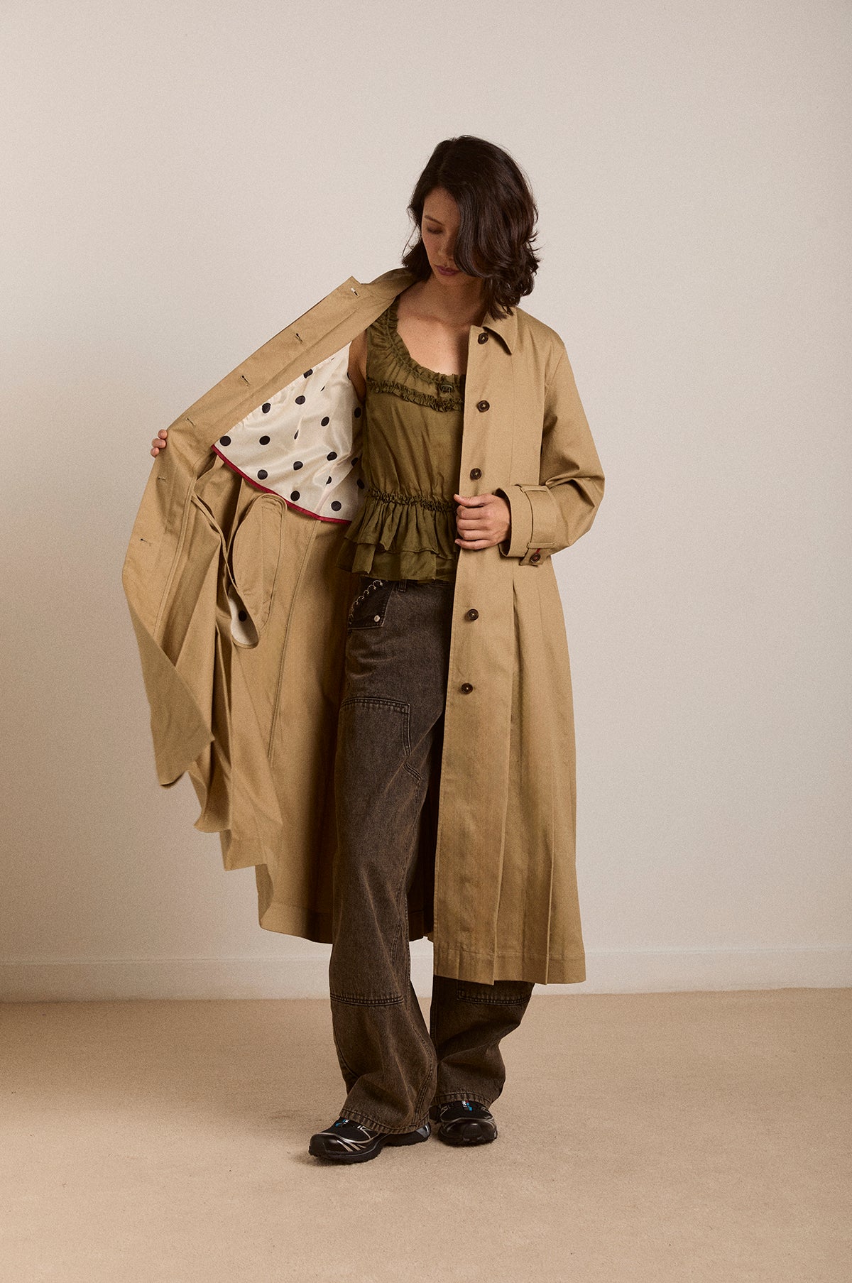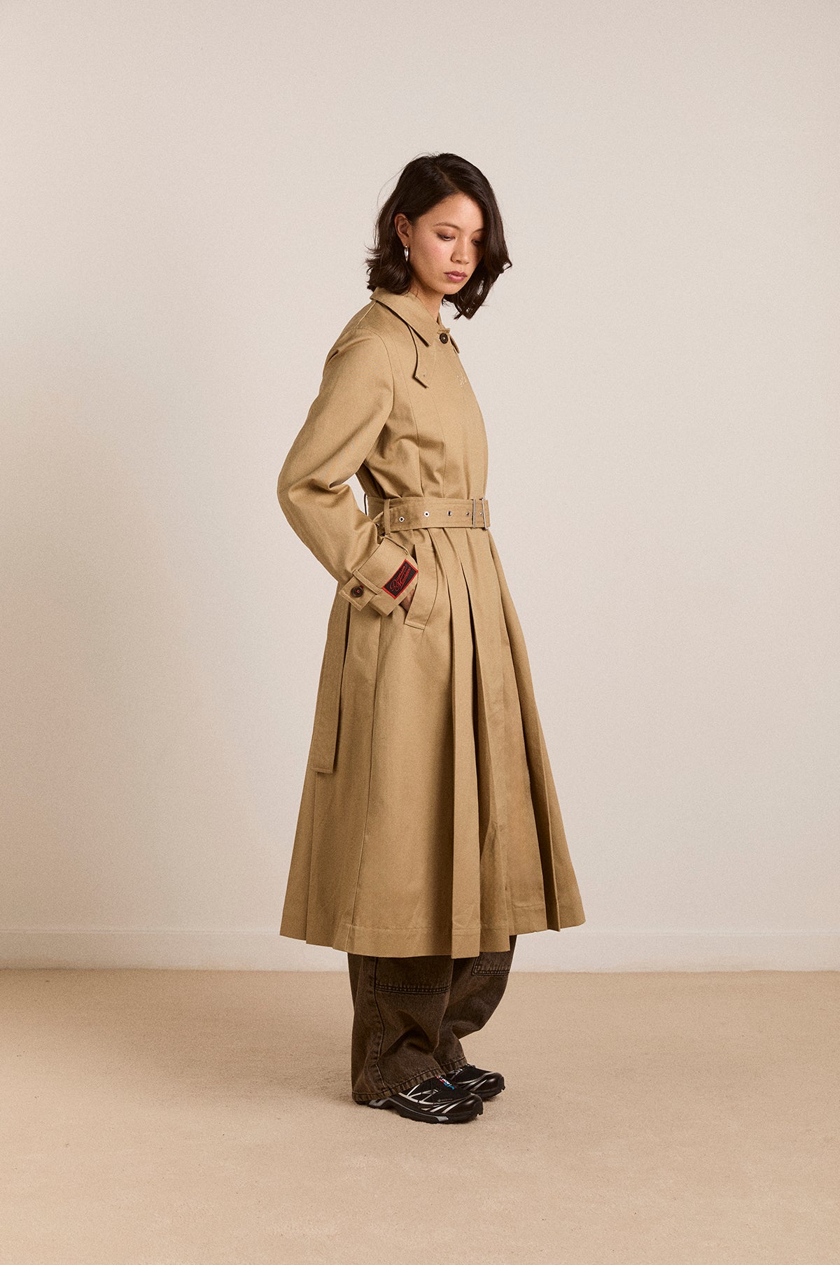 Damson Madder delivers a refined trench coat with the Sofia Pleated Trench which features a fully pleated midi-length design that moves beautifully with you. Rendered in a classic tan colour it is finished with silver-tone hardware, including a statement buckle and eyelets on the adjustable belt, and a contrast buttonhole stitch detail on the sleeve for a subtle pop of character.