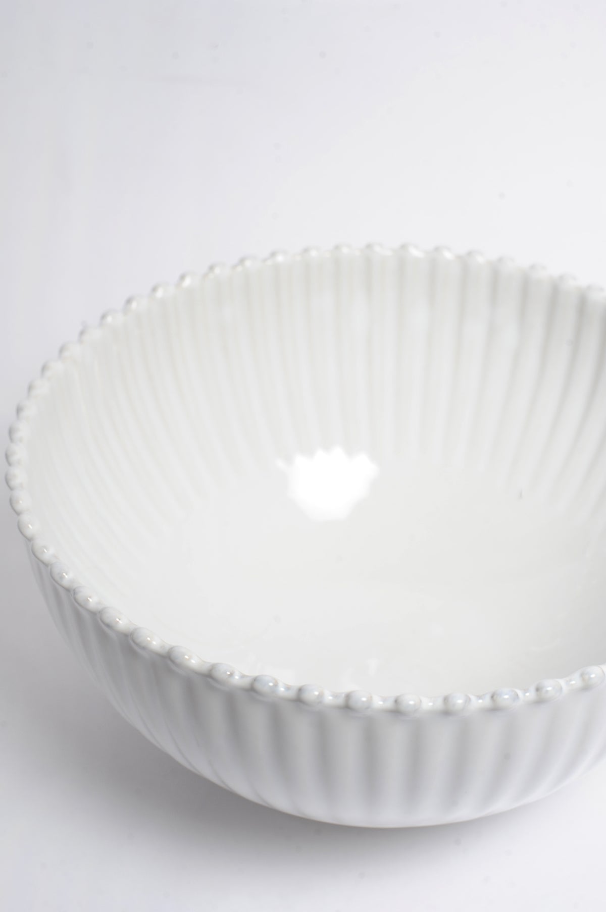 This Pearl White Centerpiece serving bowl with pearl edging and ribbed detailing will look beautiful in the middle of your dinner table and it's perfect for both fancy and everyday use. This one is in our smaller size. The Pearl collection was inspired by XVIII and XIX centuries European ceramics.