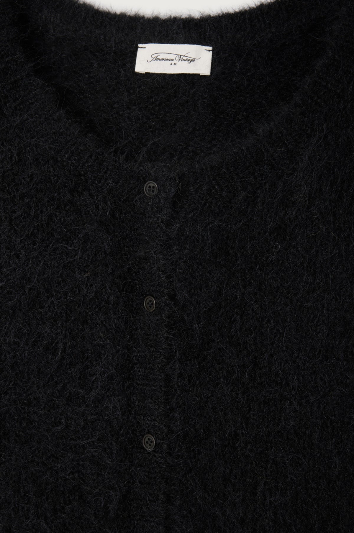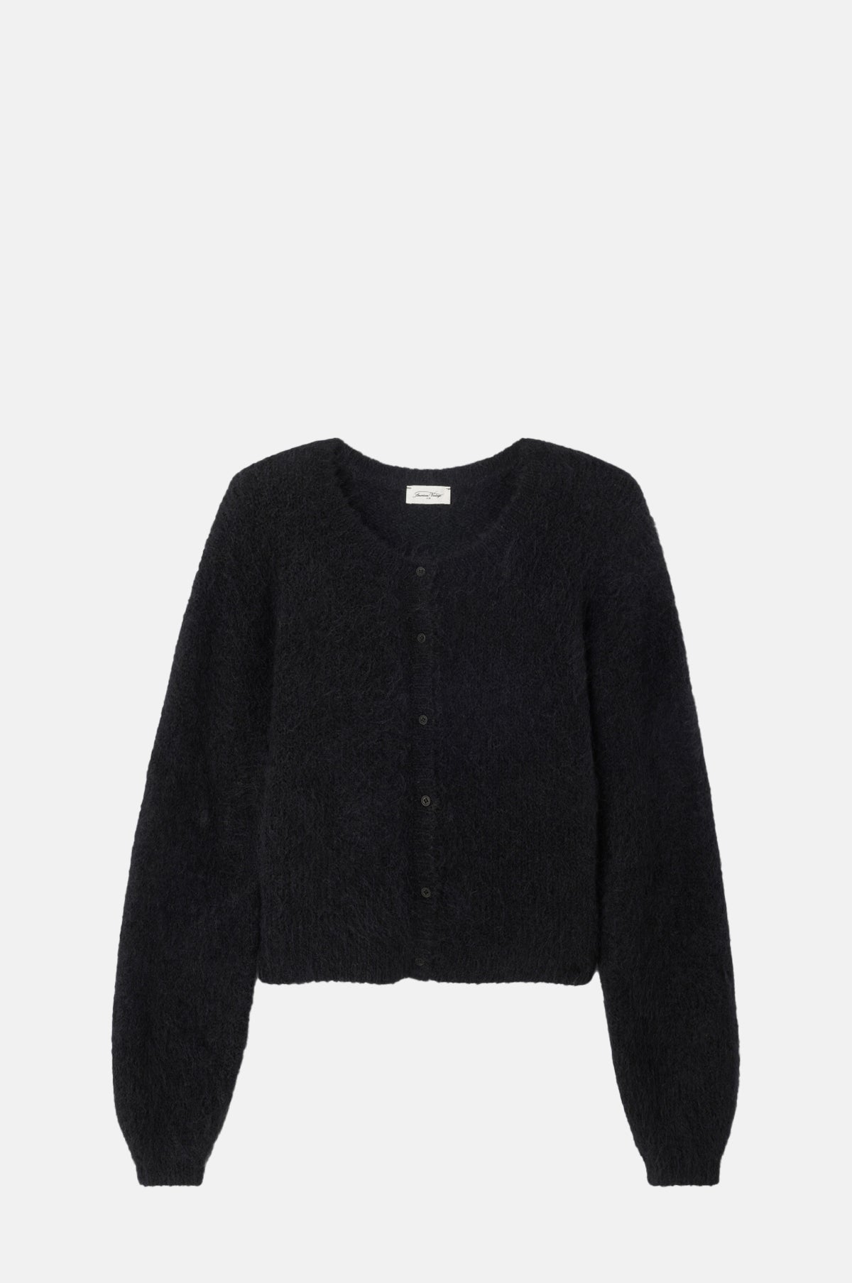 Woven partially from the luxurious fleece of the alpaca, this black fluffy cardigan from American Vintage will make a timeless addition to any well curated wardrobe. With its crew neck, tonal buttons, oversized fit and just the right amount of slouch it will add an air of effortless elegance to any outfit. We prefer a laidback look and will be pairing ours with black denim and loafers.