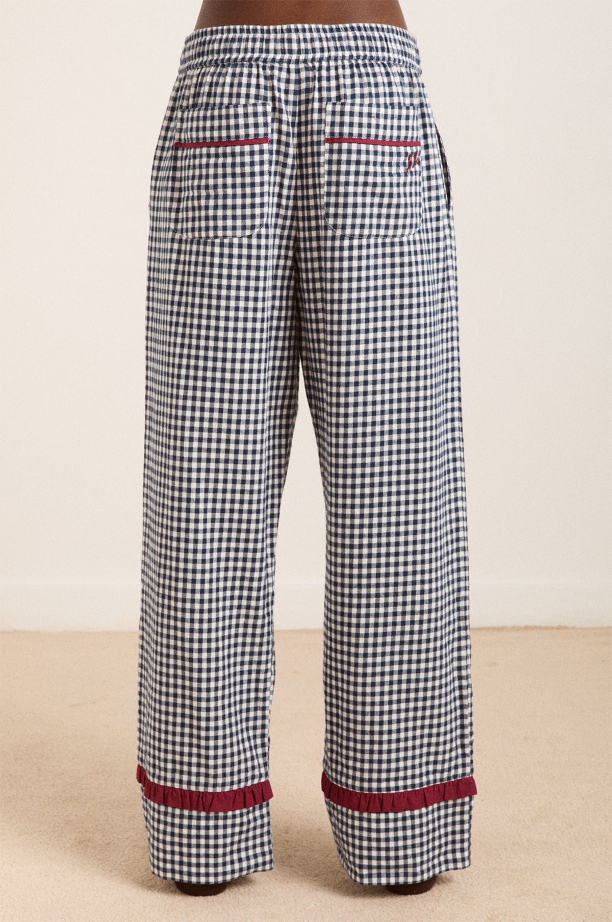 Nothing brings us more joy than a new set of pyjamas and these gorgeous gingham PJ's are making us very happy indeed. This pair is patterned in a navy gingham and finished with frilled burgundy trims. They are woven from a cotton flannel they are wonderfully soft and snuggly and make for the perfect pair of winter pyjamas.