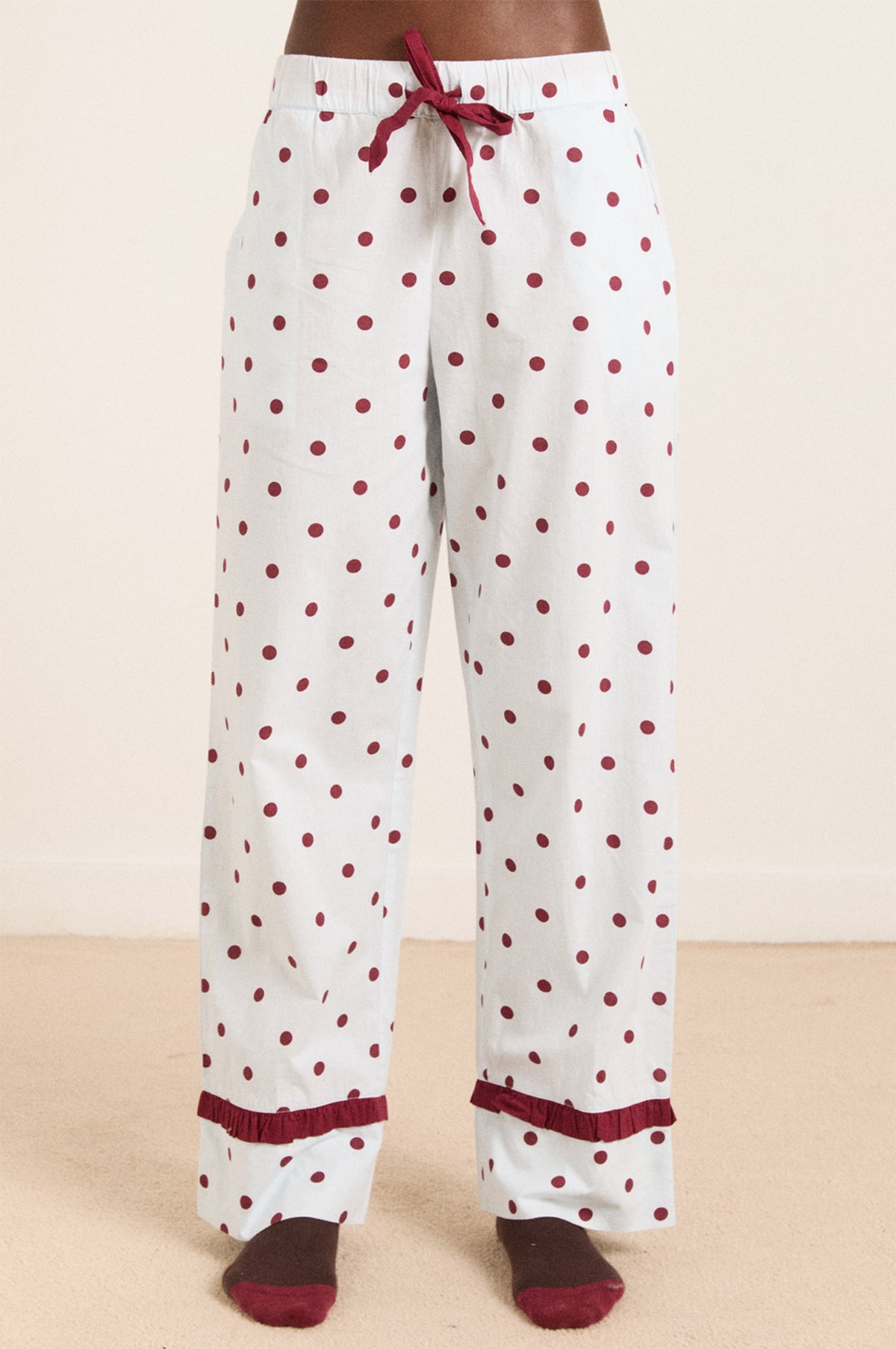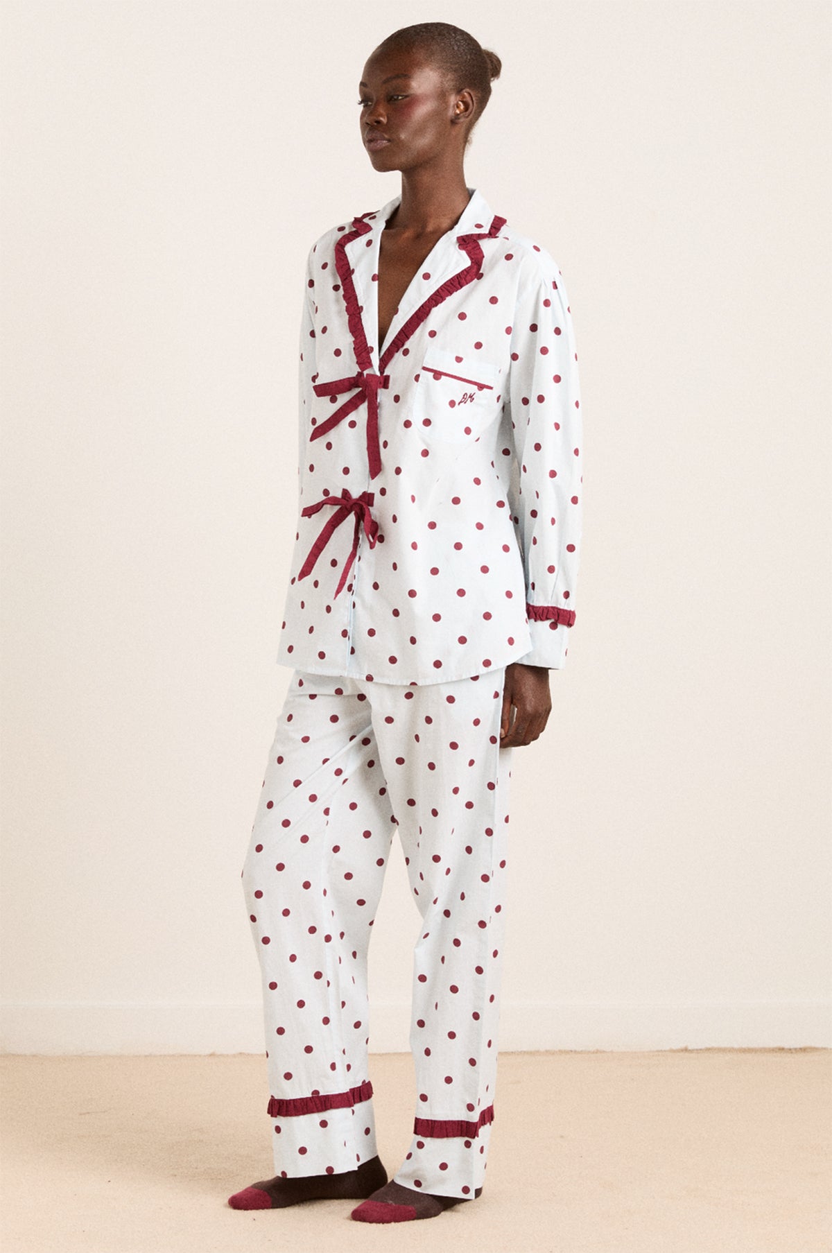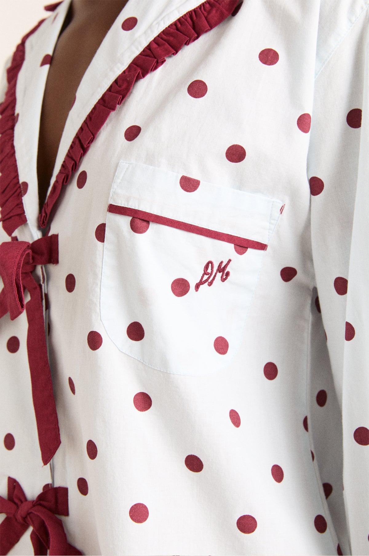 The Damson Madder Antonella pyjama set returns, redesigned in a timeless polka dot print with burgundy bow and frill details. Made from smooth 100% organic cotton, offering maximum cosiness and style, they come complete with a fabric storage bag.