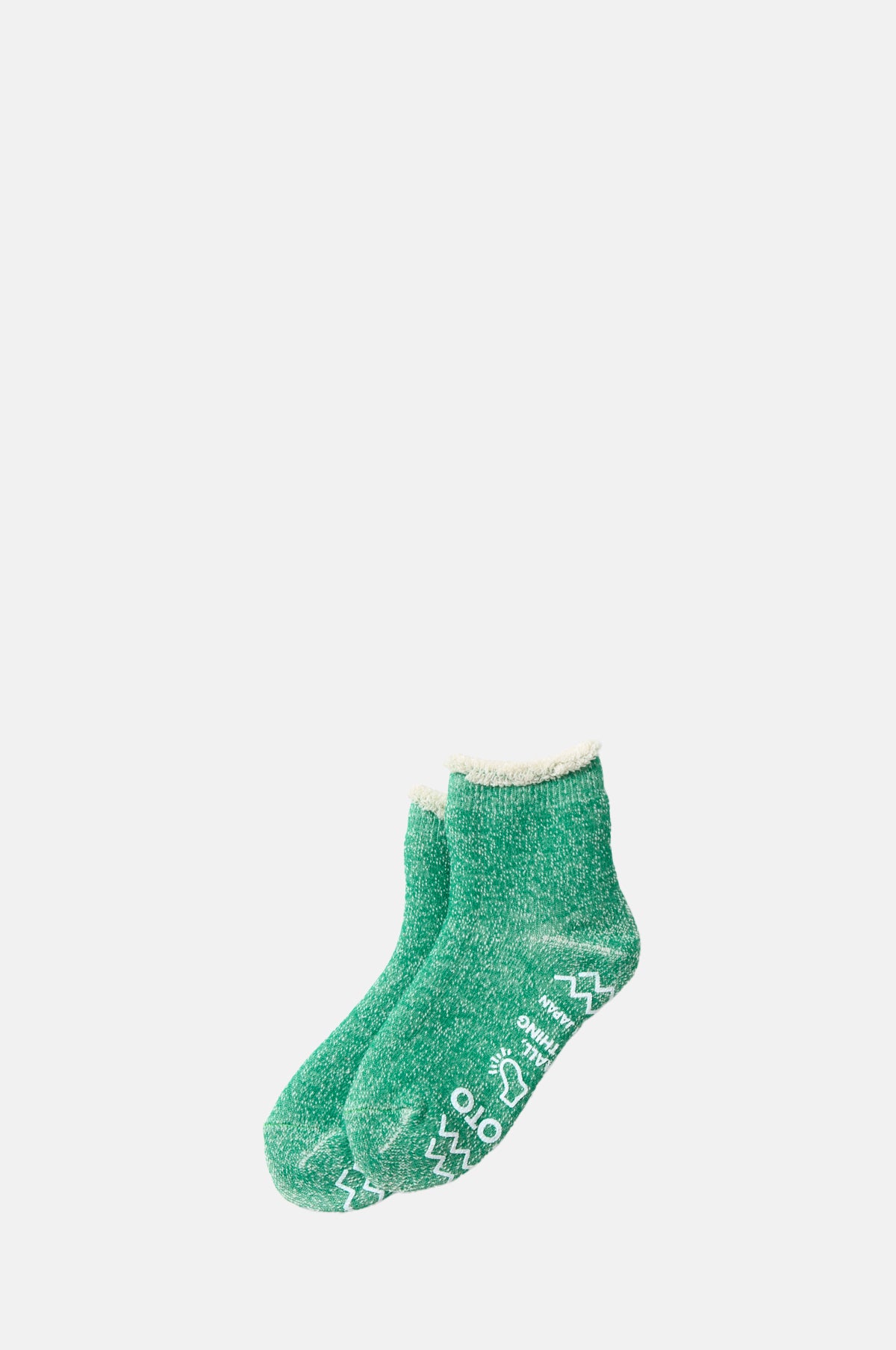 How adorable are these? These sweet socks are perfect for keeping tiny feet toasty. Produced in Japan using the double-layered “Double Face” design, allowing for different materials to be knitted on the outside and the inside of the sock to utilise different thread properties - producing a supremely comfortable sock. In a flecked green colourway and with an anti-slip sole for extra grip. Also available in pink and blue.