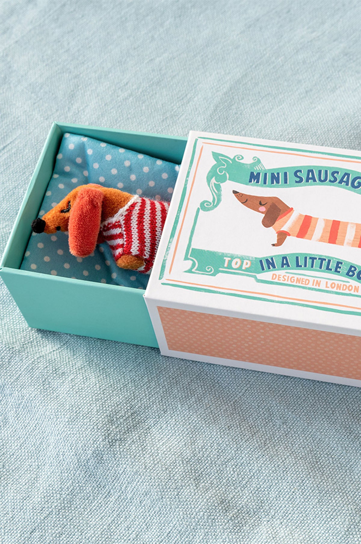 Little ones will love caring for this adorable sausage dog! This cuddly little Dachshund toy comes with his very own stripy jumper and polka dot blanket, all tucked up inside an illustrated gift box. Super cute!