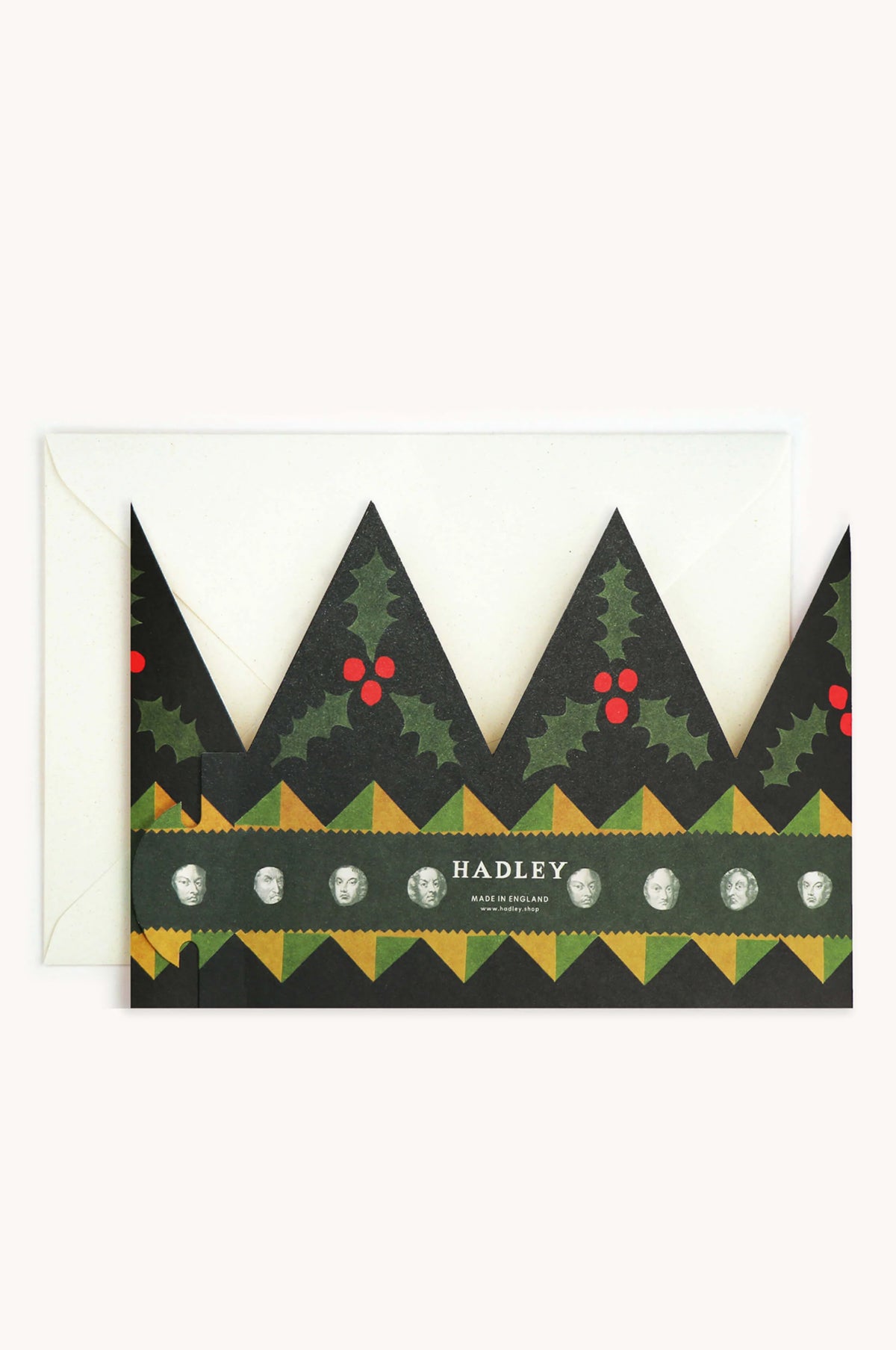 Artist designed, quirky and fun, this festive black patterned crown comes in a cream coloured envelope.
