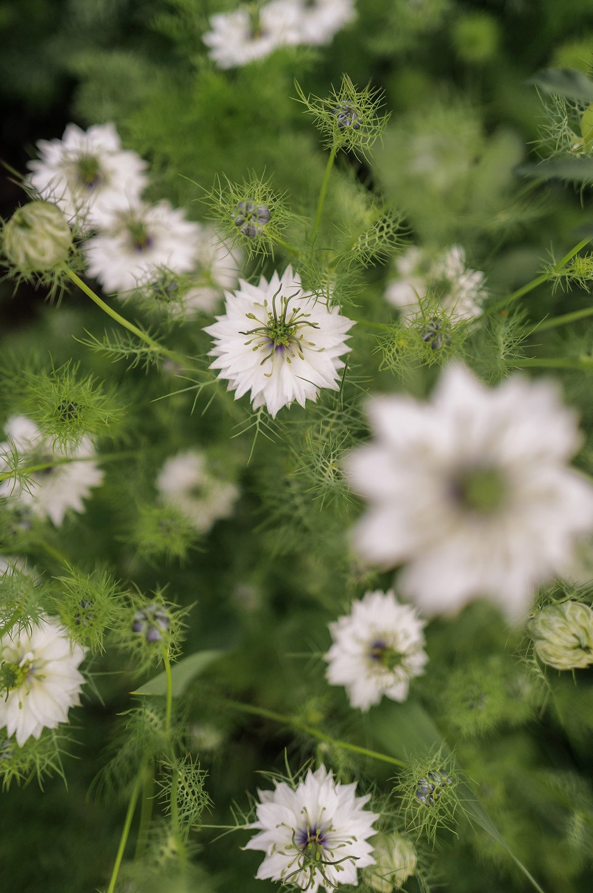 Nigella, also known as Love-In-The-Mist, for its delicate flowers appearing out from its gauzy fronded foliage, is an absolute must in the cutting garden. This variety is pure white, with dramatic plum coloured seed pods that keep their colour even when dried.