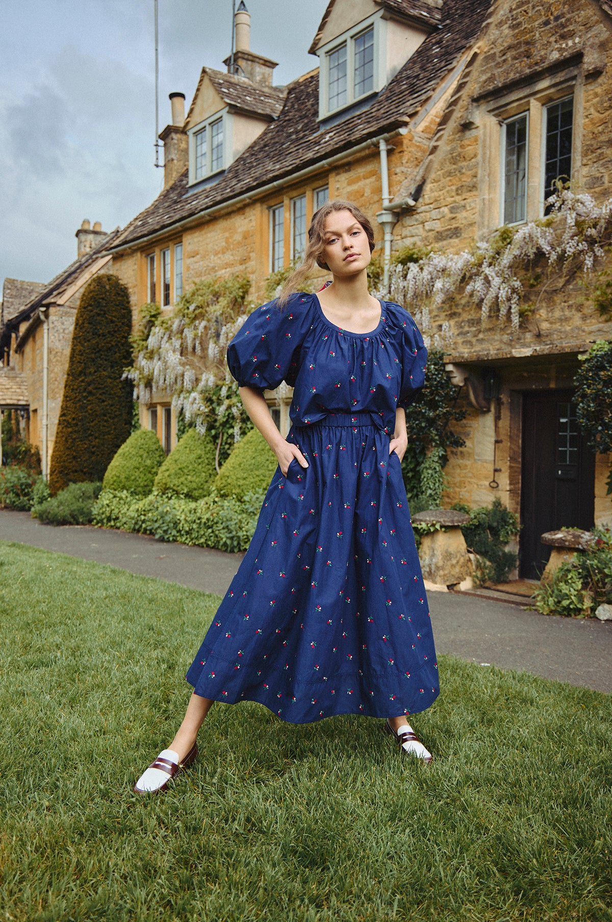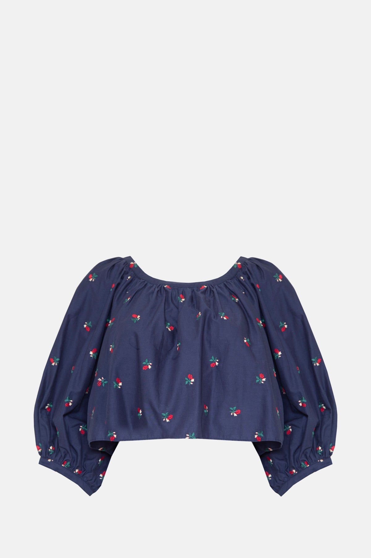 This enchanting top from Hunter Bell has a graceful scoop neckline and balloon sleeves. We love the rich navy shade and all over red ditsy rose print. The cropped silhouette keep things sweet and the thicker cotton fabric means this can be worn on cooler days. Pair with the matching skirt or wide leg jeans.