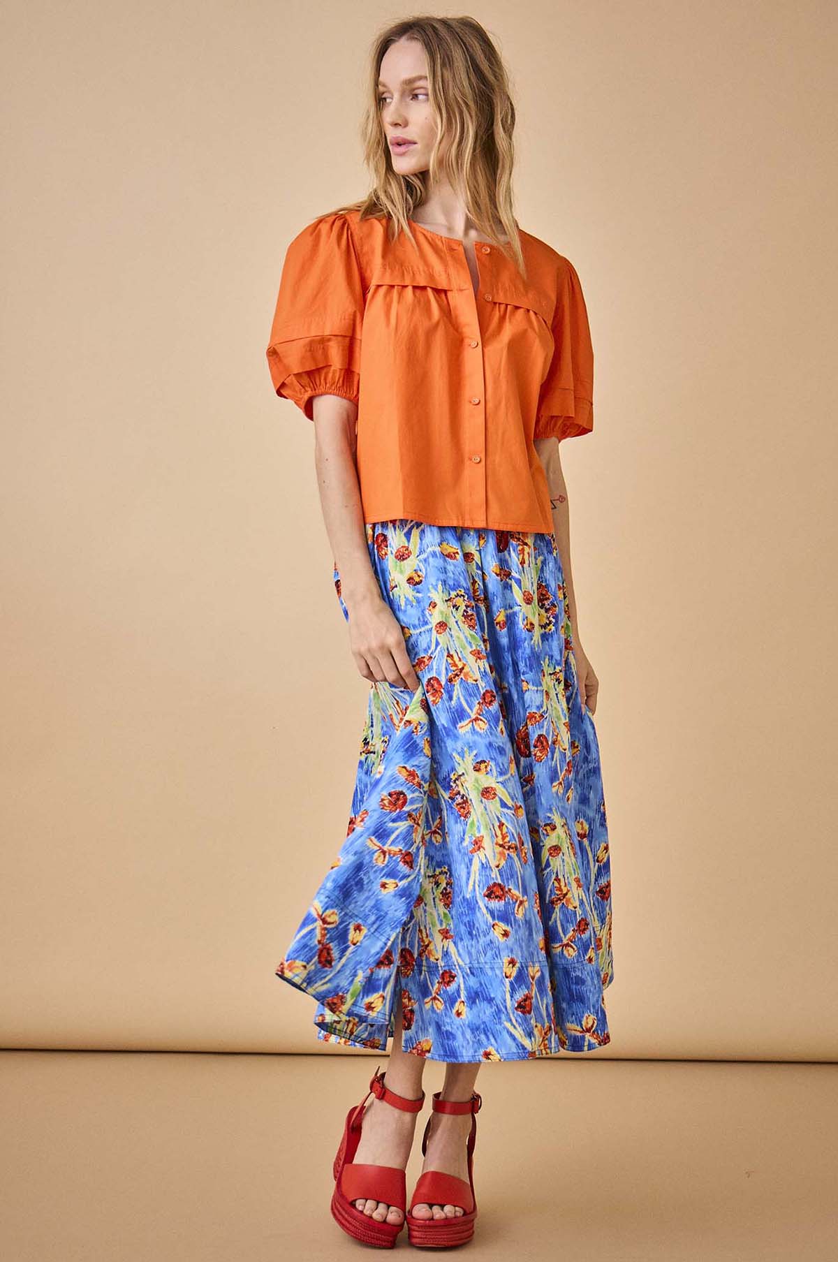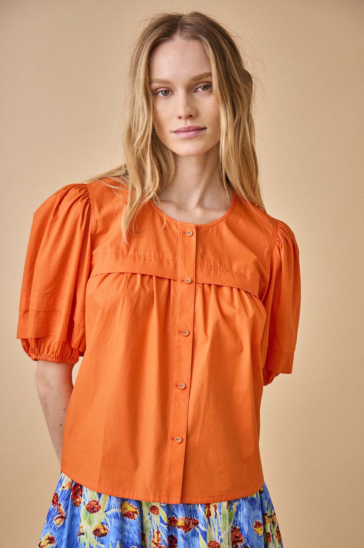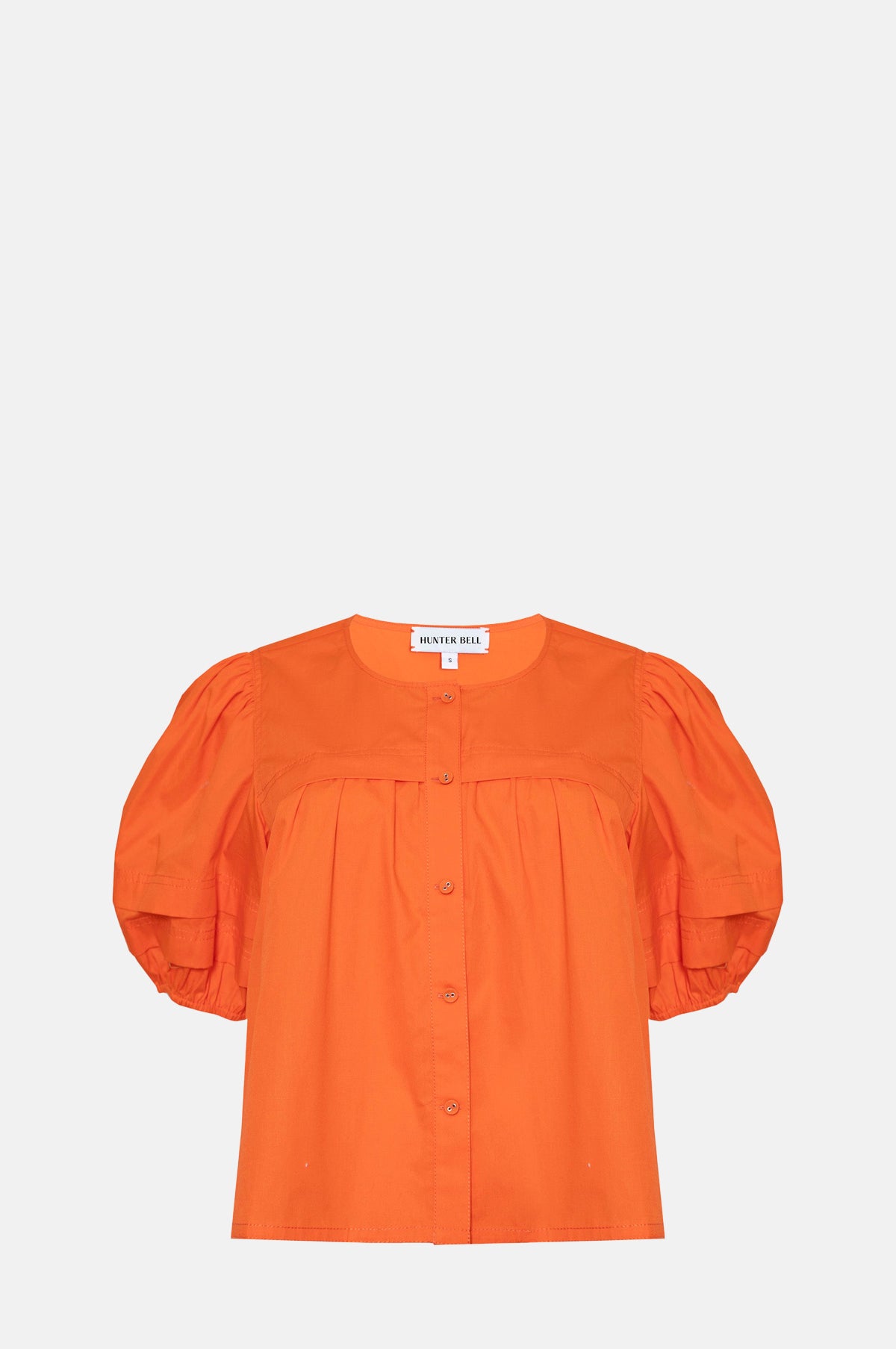 In a vibrant shade of Vermillion, the Leanna Blouse from Hunter Bell is sure to brighten up your summer wardrobe. A short bubble sleeve top it has shirring at the front and back yoke. Made from cotton poplin, this lightweight and airy blouse has a flattering and comfortable fit and will add a fresh and stylish touch to trousers, skirts, and shorts.