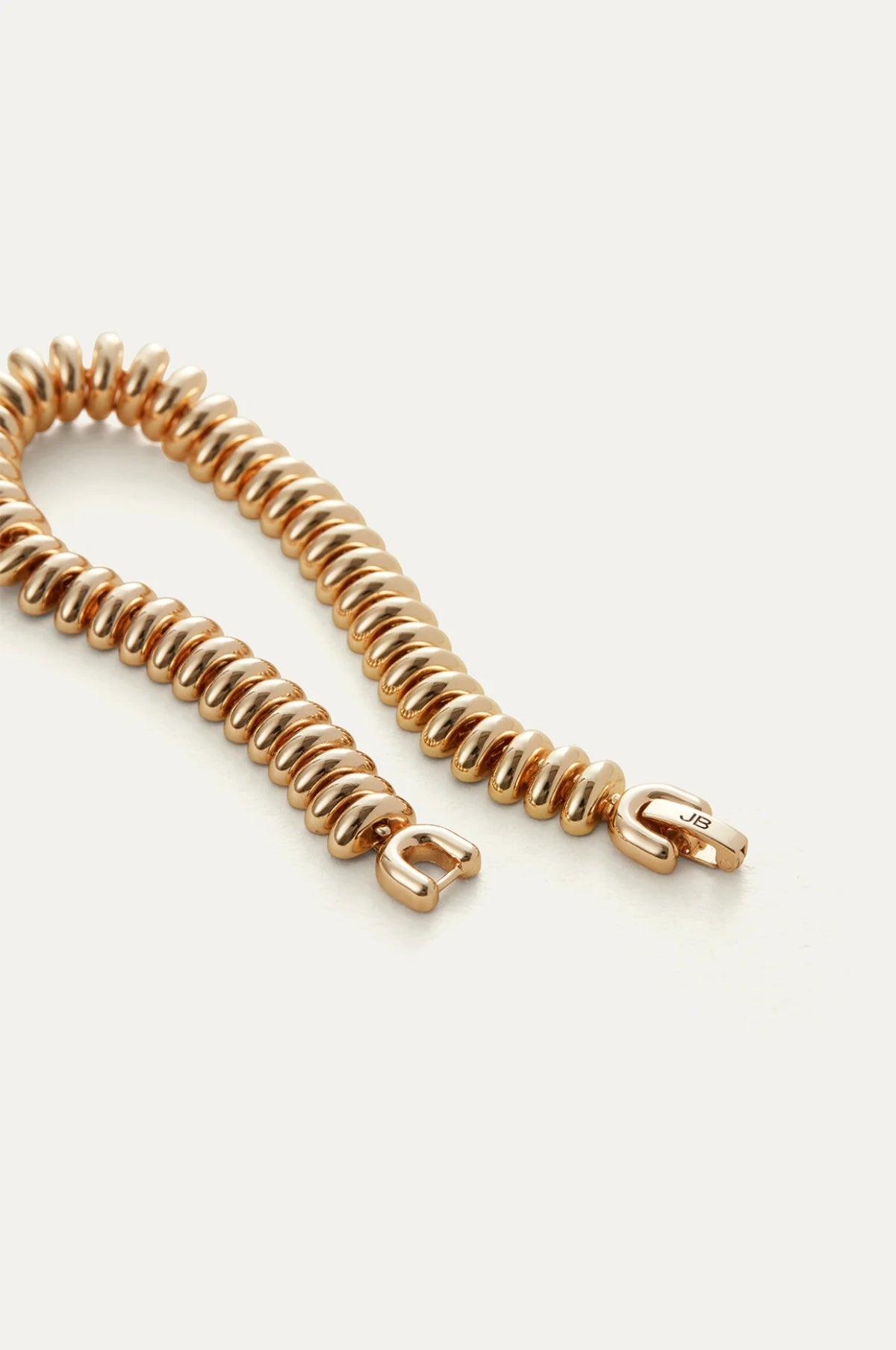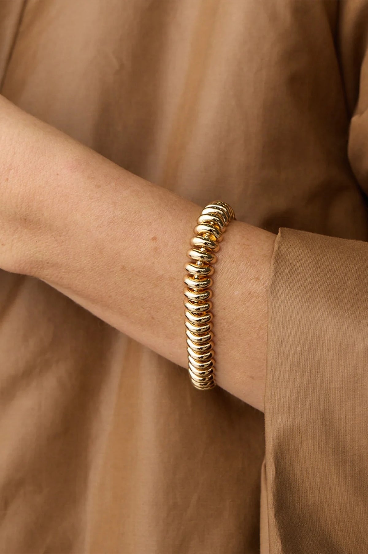 We are definitely in our gold era and we adore this slinky bracelet from Jenny Bird. Gorgeously fluid with a ribbed texture and caterpillar construction, this unique bracelet is both contemporary and timeless. Finished in high polished gold it sits flush on the wrist, has a slim fit, and a vintage inspired foldover closure.