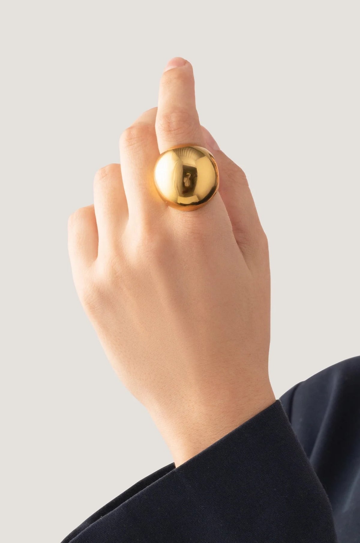 An oversized spherical ring from Jenny Bird, the Supernova truly has star power. A real statement piece, this high polish goldplated ring is bold and ultra fabulous. With discrete curved notches on the band, this sits really comfortably on the hand and is not too weighty thanks to the hollow sphere.