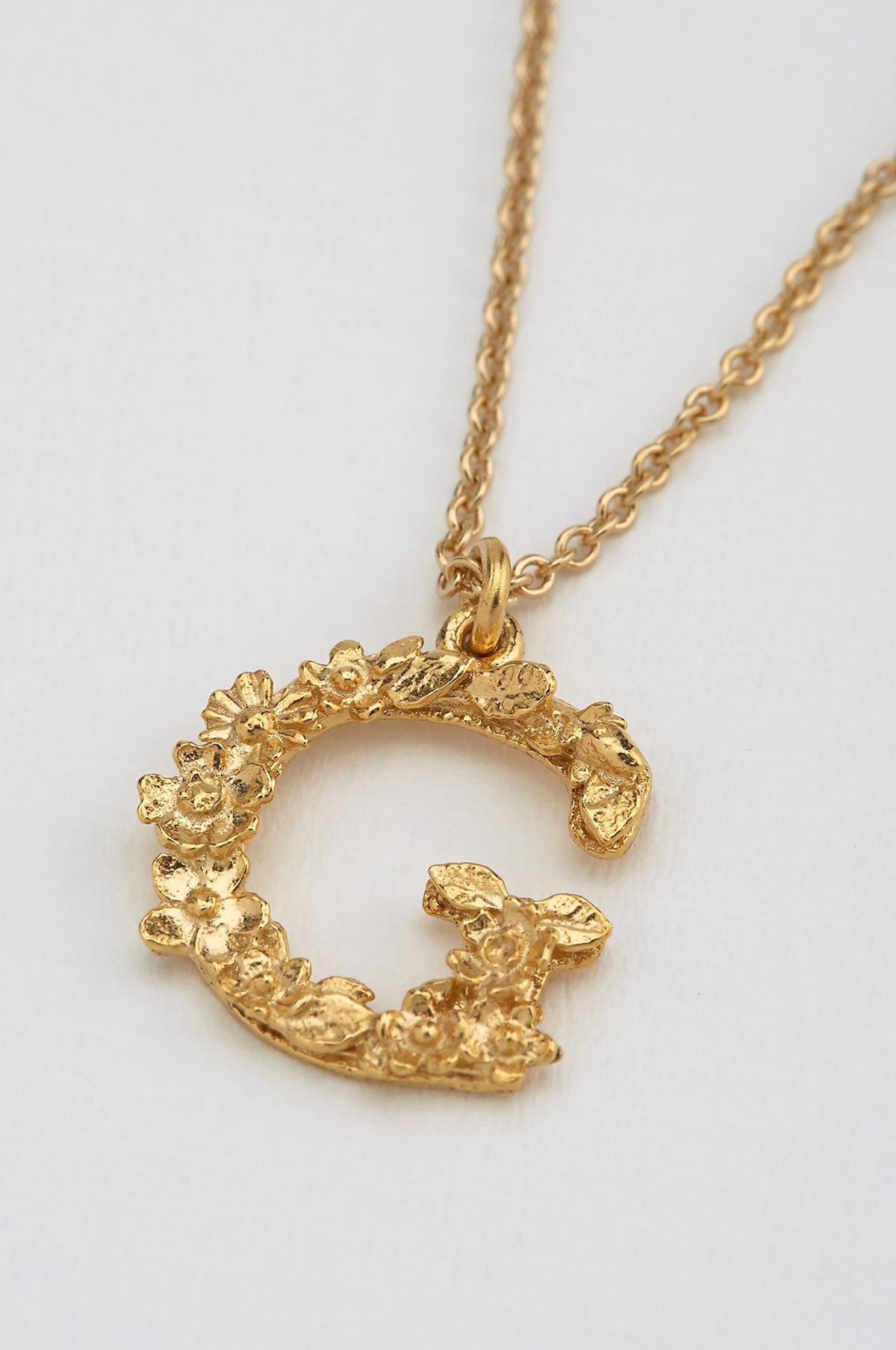 Floral letter 'G' necklace blooming with tangled florals, sculpted leaves and intricate petals from Alex's New Collection 'The Floral Alphabet'.