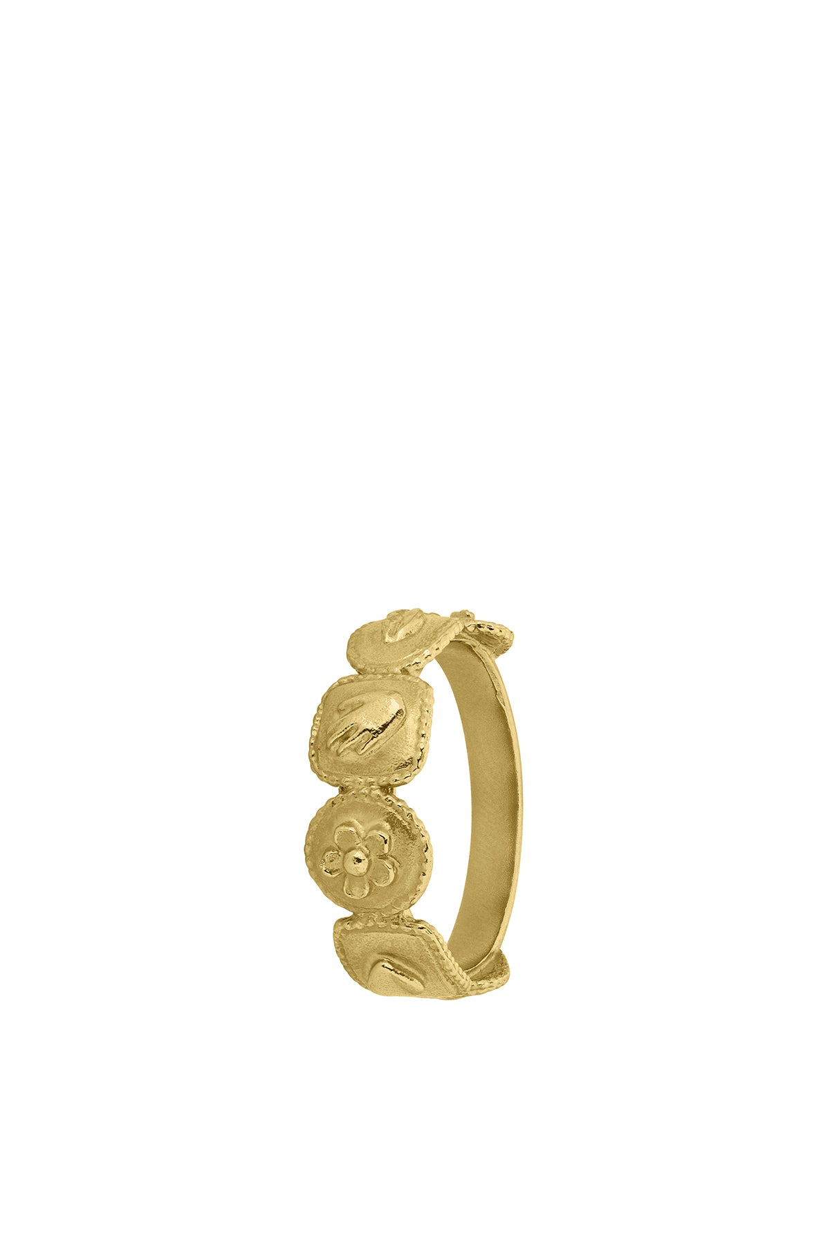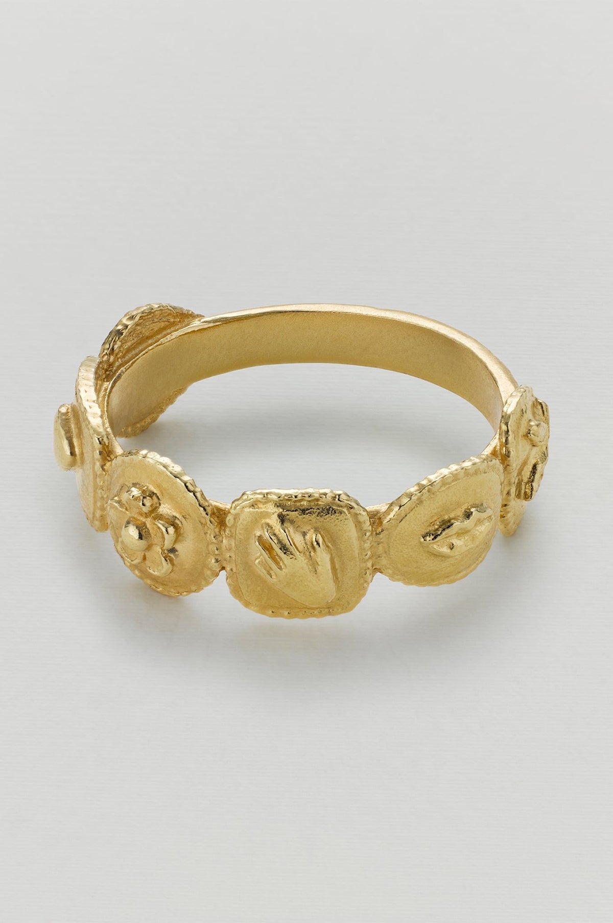 Intricate Ex-voto tokens are joined to form this half wreath ring in celebration of the senses and as an expression of gratitude to nature. A mix of intricate Ex-voto inspired tokens are joined up to create a delicate ring that celebrates the senses, and forms a wearable reminder to stay connected to our natural environment. Handmade from sterling silver and plated in 22 ct fairmined gold.
